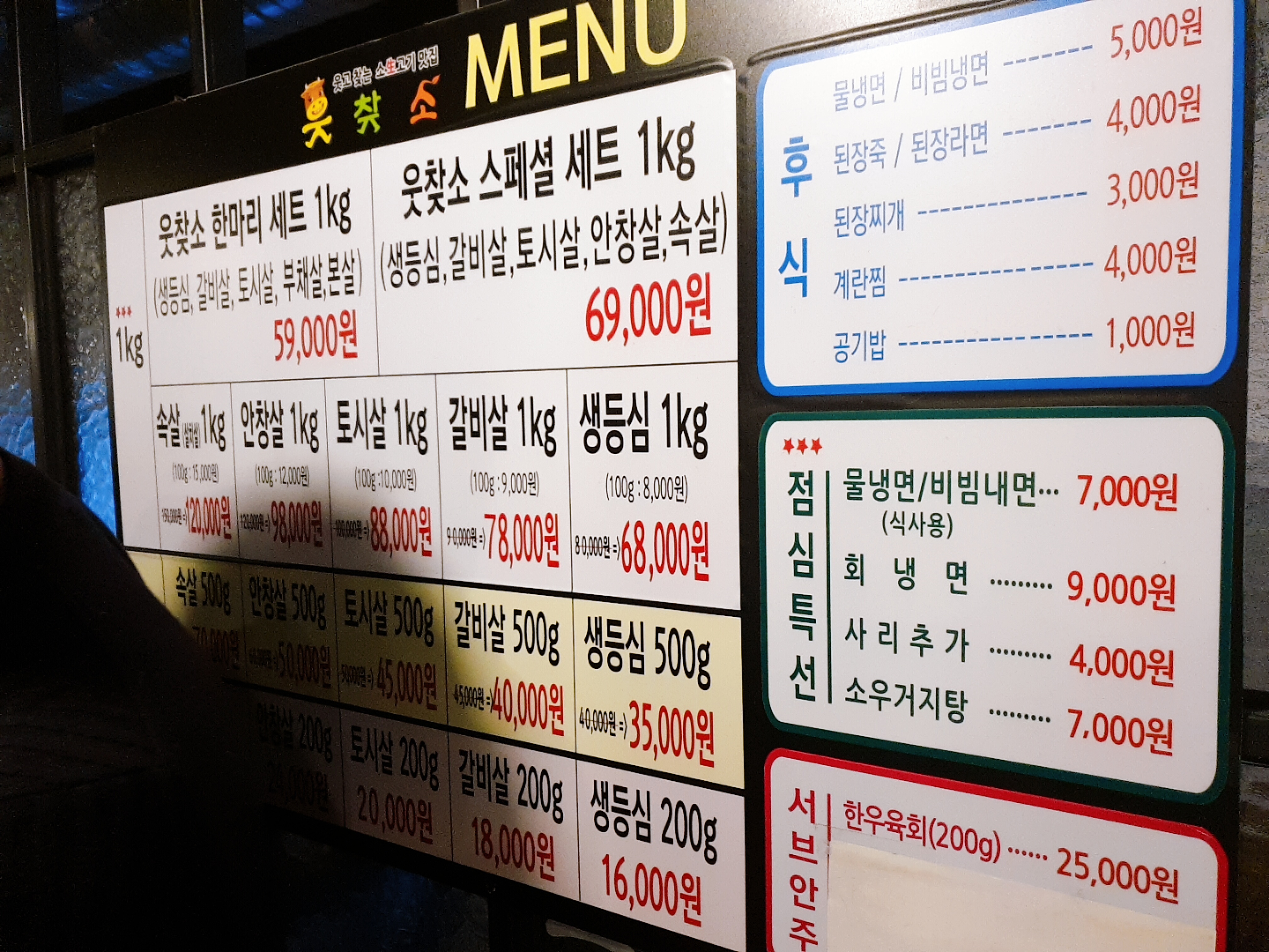 메뉴판 찍는데 조금 흔들렸다..ㅠ 우리는 웃찾소 한마리 세트를 시켰다!