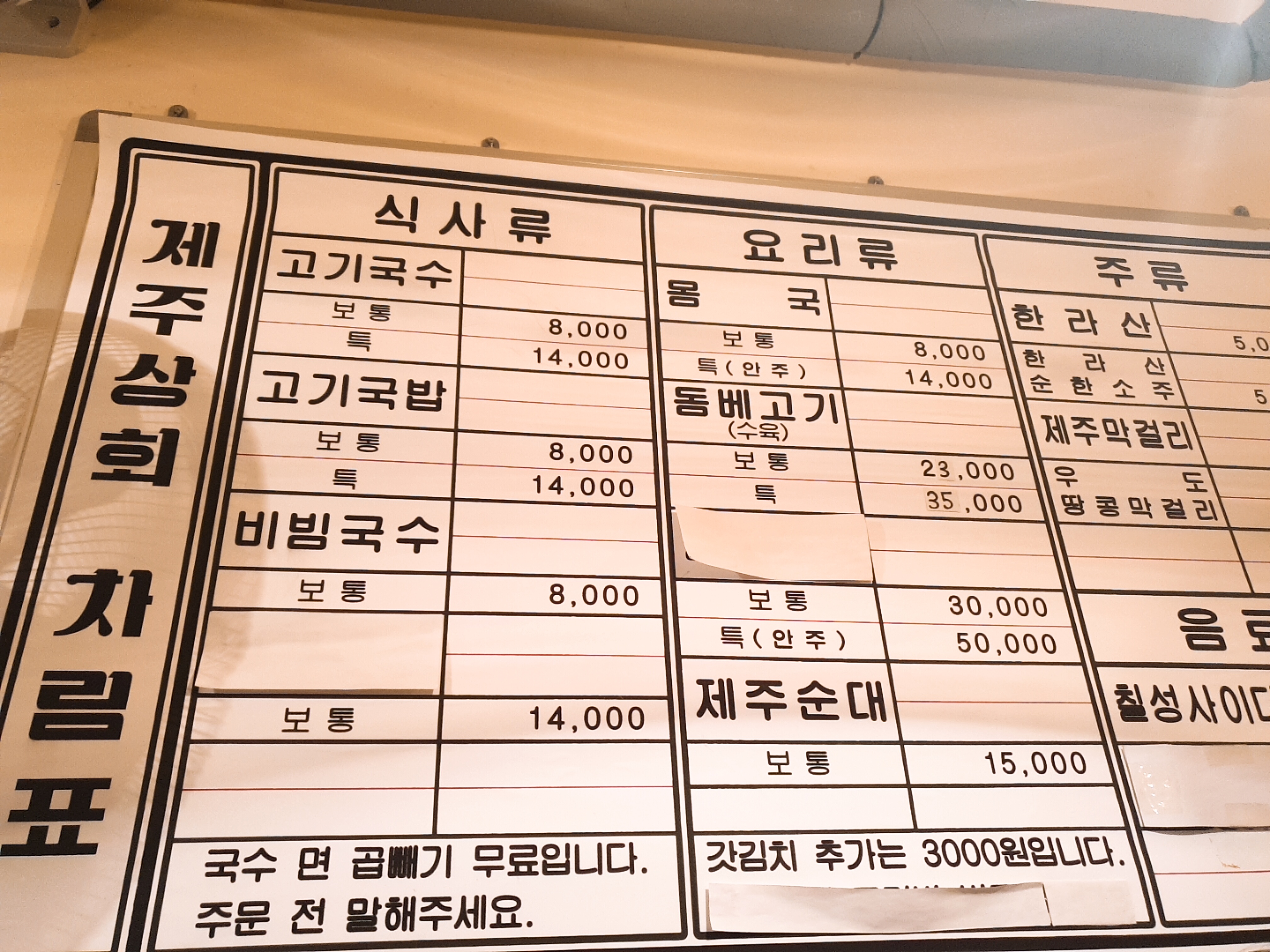 메뉴판. 보통 식사 메뉴로는 고기국수나 비빔국수를 먹는다!