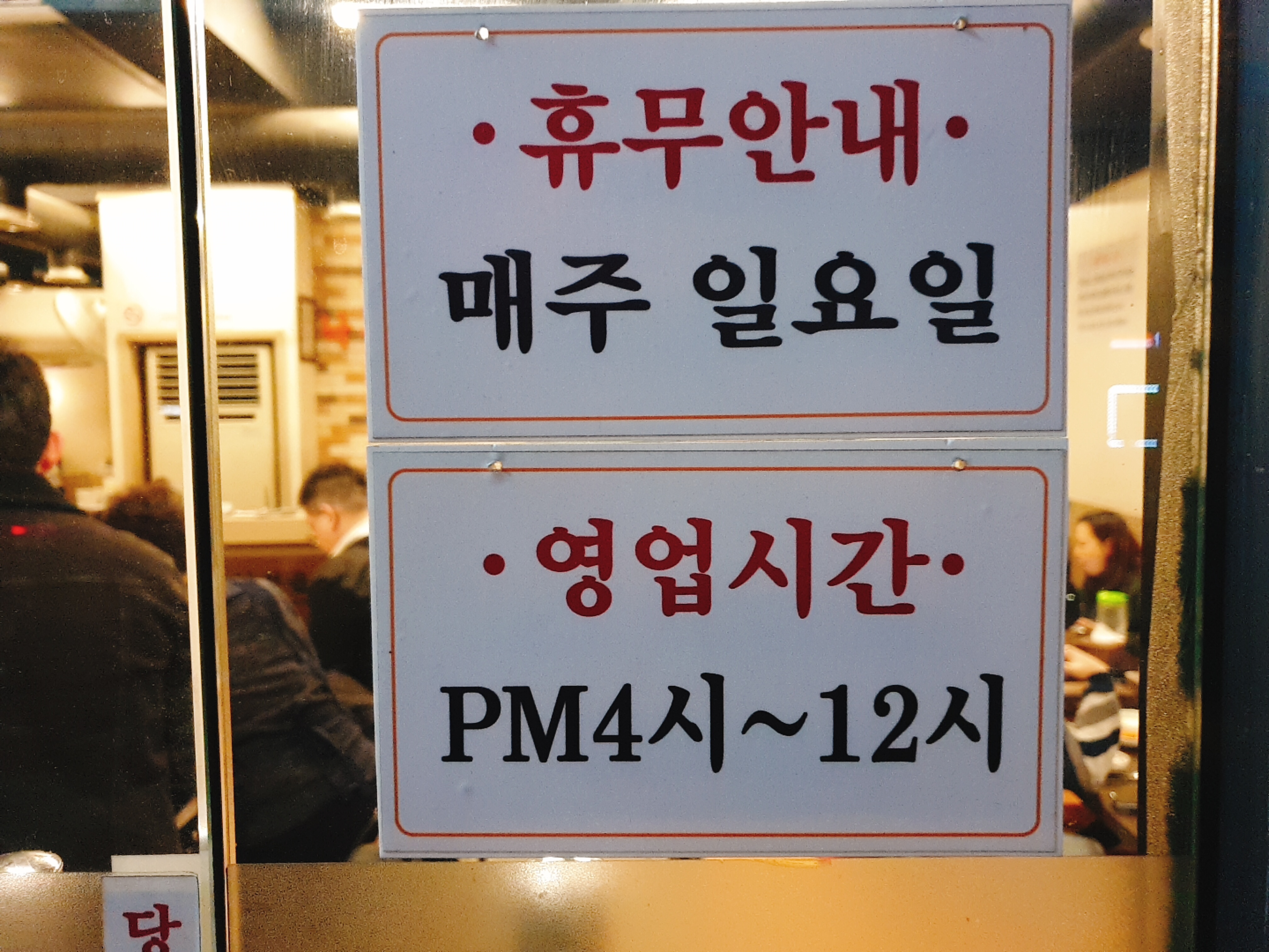 시간 체크하시길! 영업시간은 4시에서 12시까지고, 매주 일요일은 쉰다.
