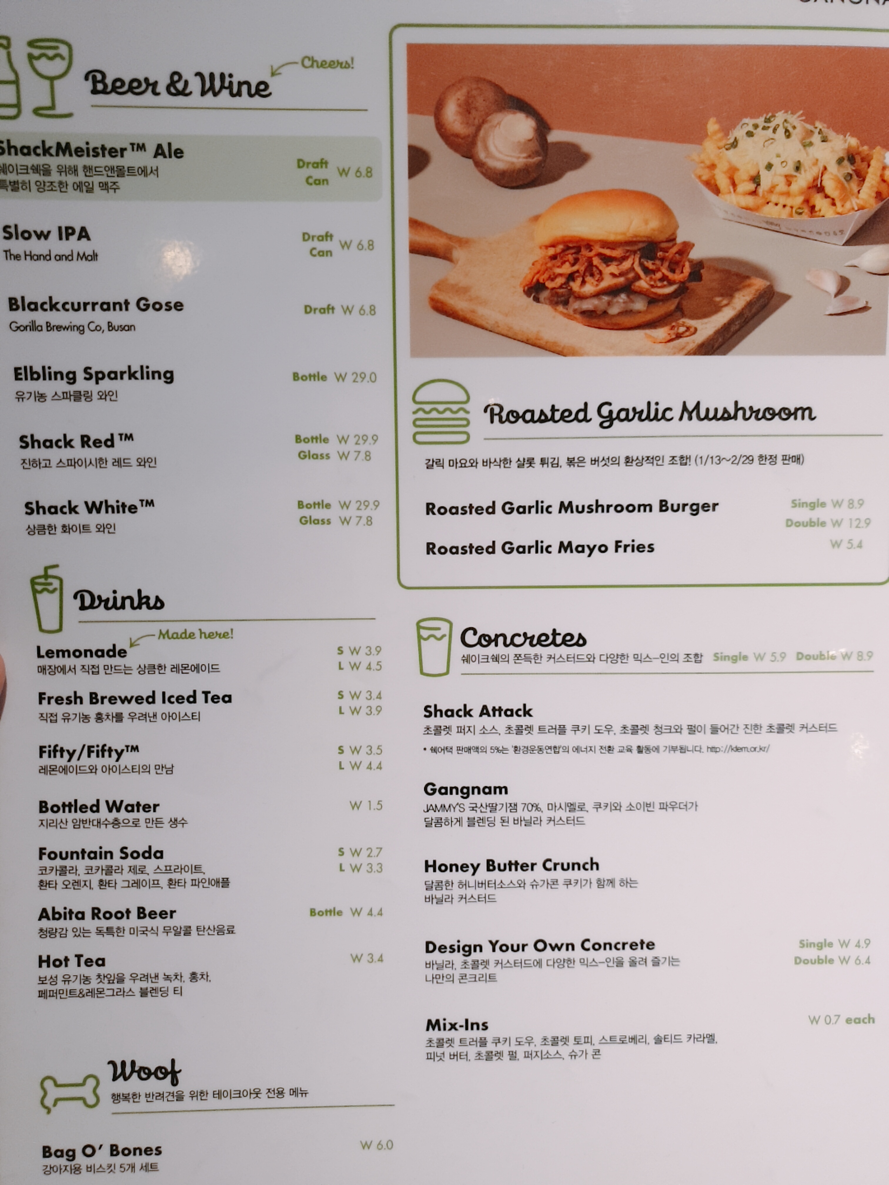 메뉴판 1. 우리는 쉑버거 싱글 하나, 더블 하나를 시켰다.