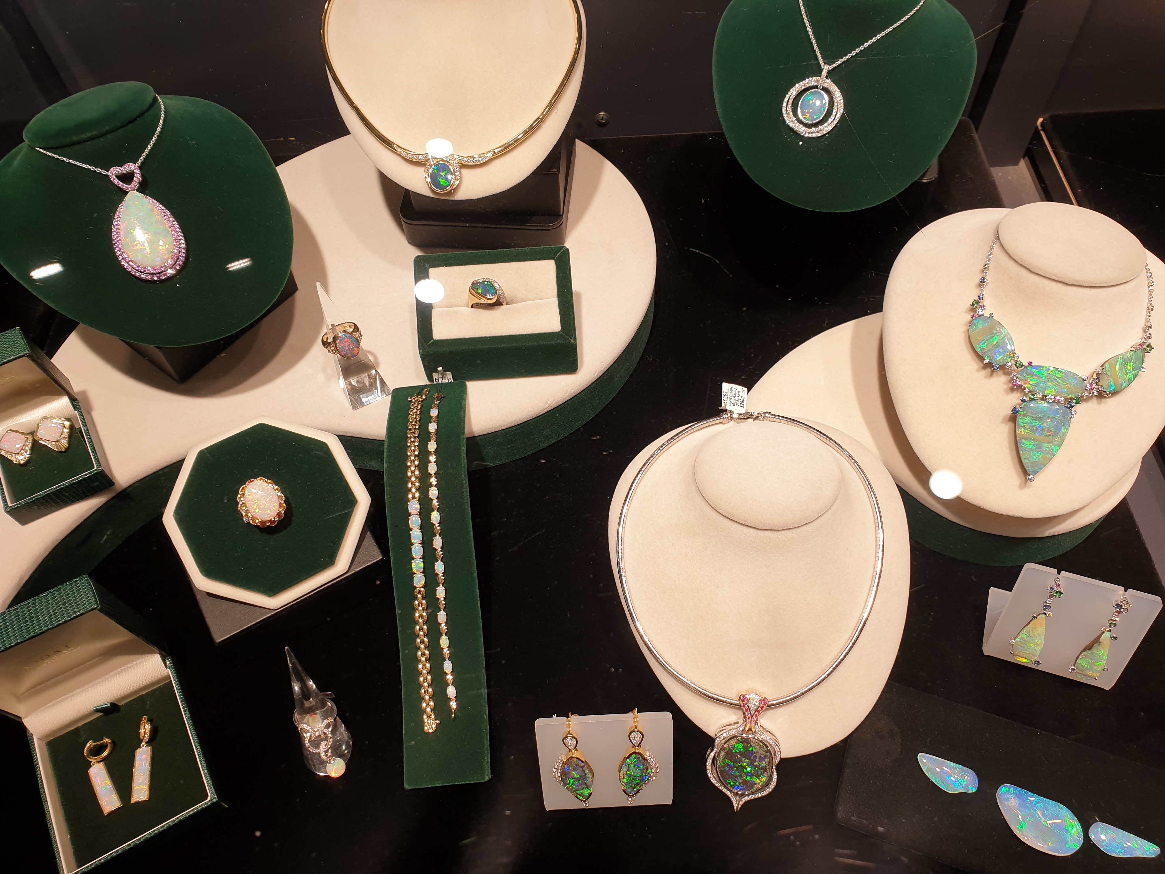 종류에 따라분류한 오팔들. 조명 탓인지 빛깔을 담아낼 수 없어 안타깝다.
