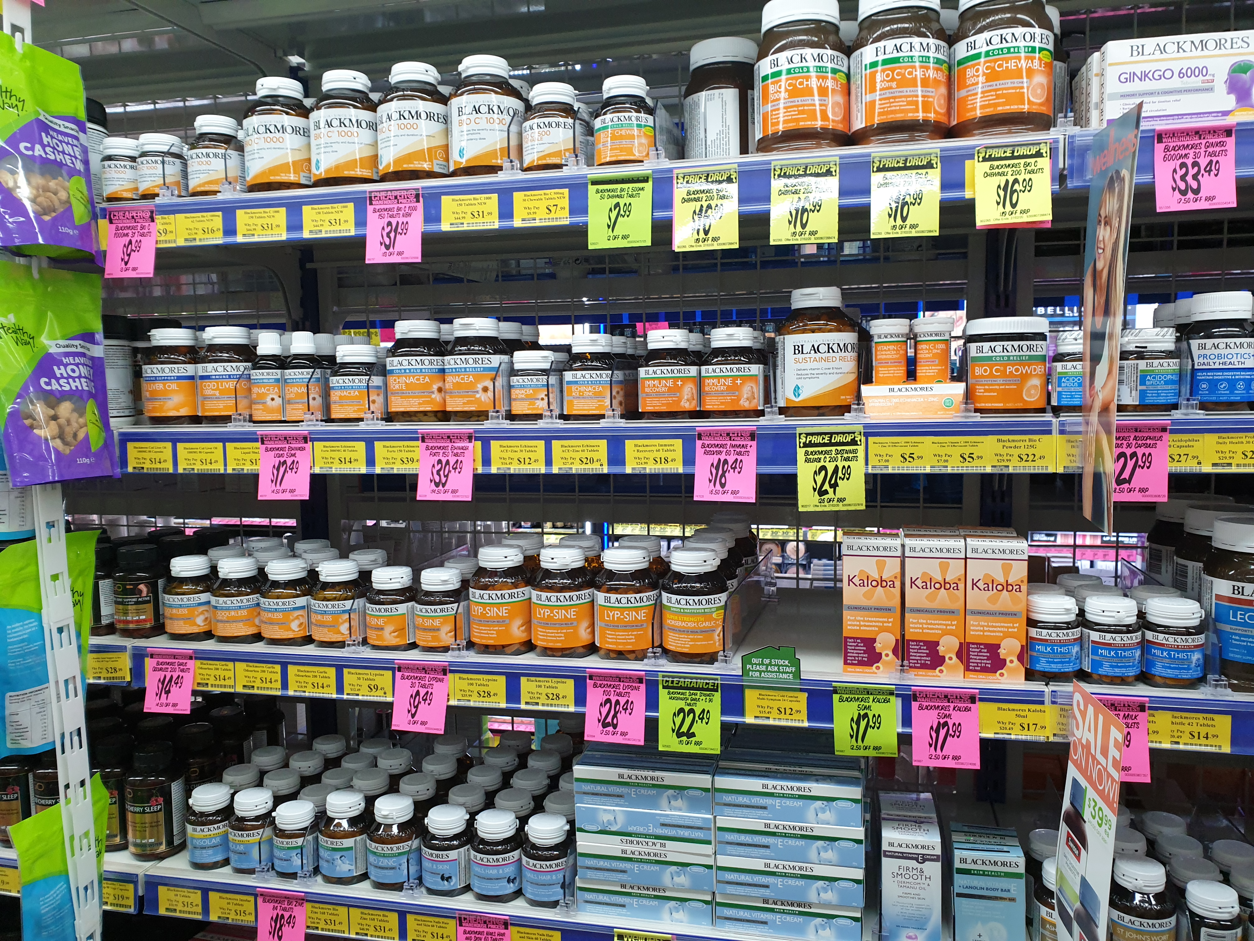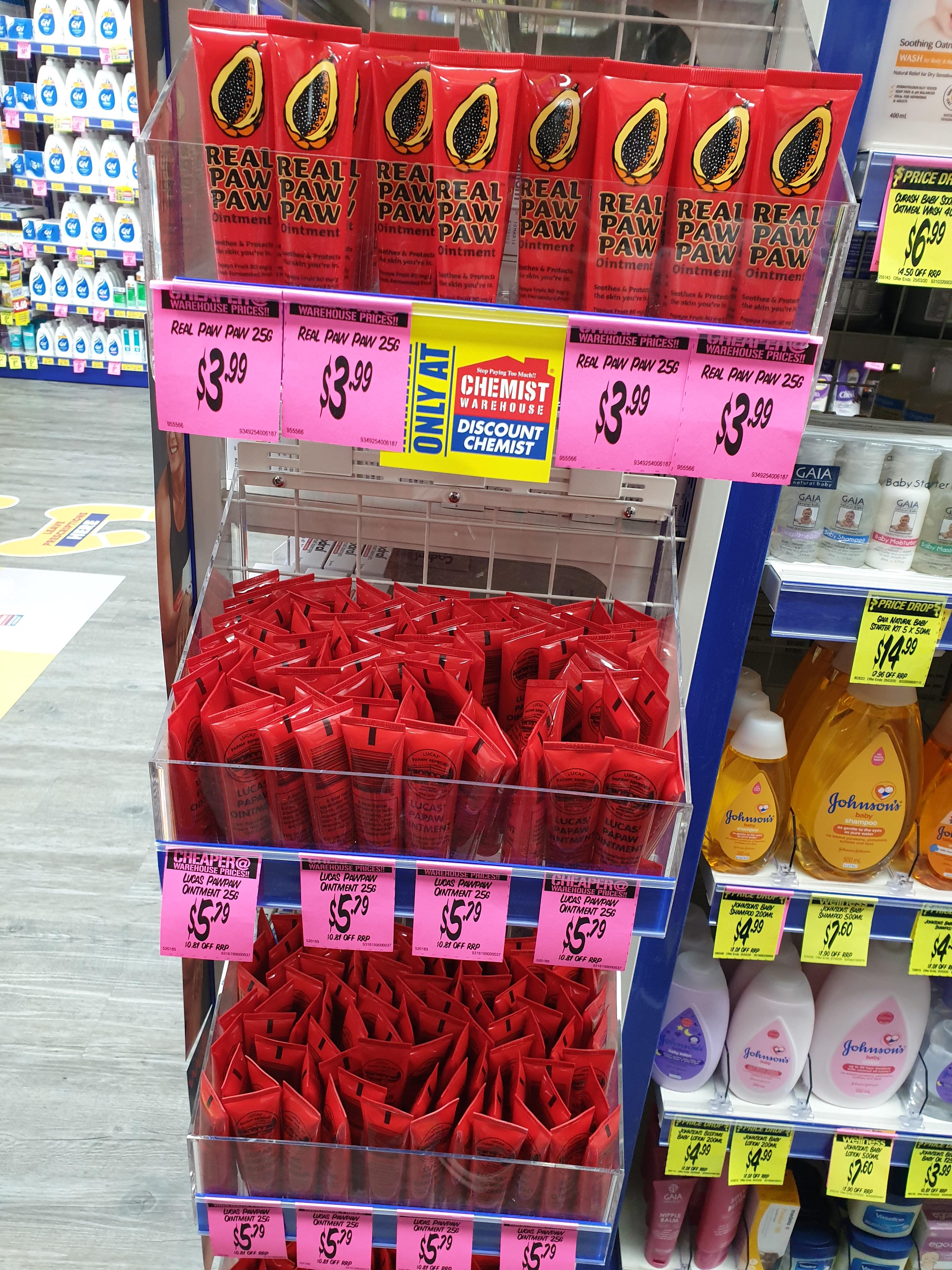 케미스트 웨어하우스라고, 우리나라의 보통 약국보다 훨씬 큰 규모로 약/영양제 등을 대량으로 판매하는 곳이 있다. 여기서 살 제품은 두 가지로, 프로폴리스와 포포크림이다. 한국에서 사는 것보다 훨씬 싸고, 포포크림의 경우는 피부의 상처나 보습 용도로 매우 효과적이다 ㅎㅎ