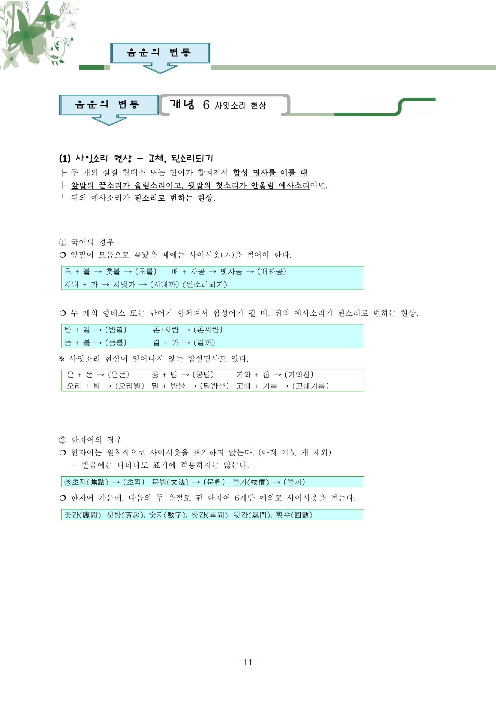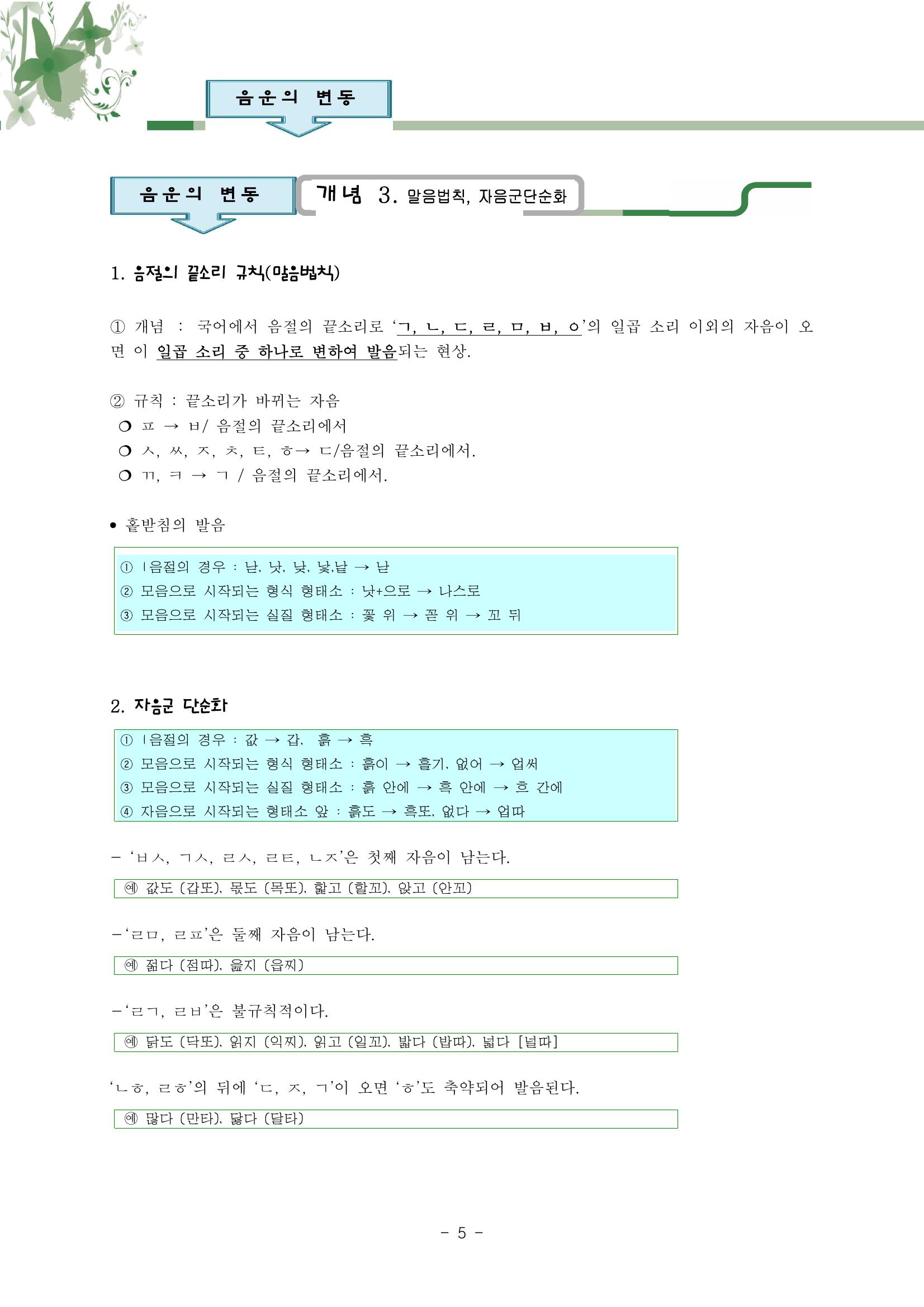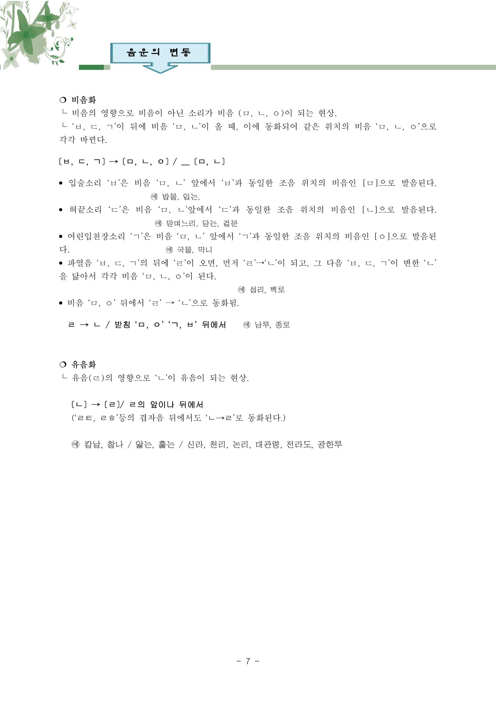 국어 문법 정리 : 음운의 변동(비음, 유음, 구개음, 비음화, 유음화, 개구음화, 경음화, 음절의 끝소리 규칙, 자음군 단순화, 자음 동화, 모음 동와, 모음 조화, 구개음화, 사잇소리 현상) 본문
