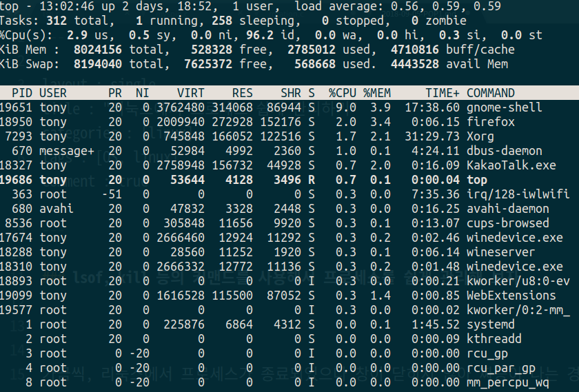 top command를 이용하면 현재 돌아가고 있는 프로세스에 대한 정보들을 쉽게 조회할 수 있다.