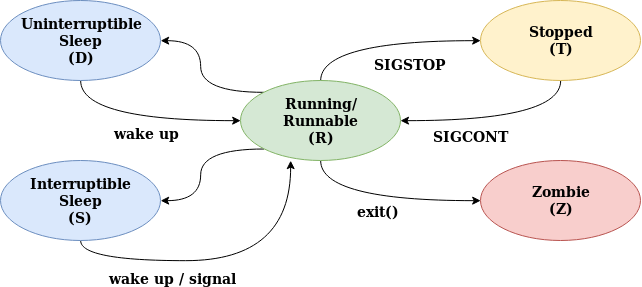 마지막으로 Zombie 상태는 조금 독특한데, 이는 해당 프로세스가 종료되었으나 아직 커널에 해당 프로세스에 대한 정보를 담고있는 리소스가 사라지지 않고 남아 있음을 의미한다. 프로세스가 실행되기 위해서는 task_struct(프로세스 PID, 상태 등등의 정보를 담고 있는 구조체) 등의 리소스가 커널에 존재해야 하는데, 해당 프로세스가 종료했을 때 바로 이러한 리소스들이 사라지지 않는다.
