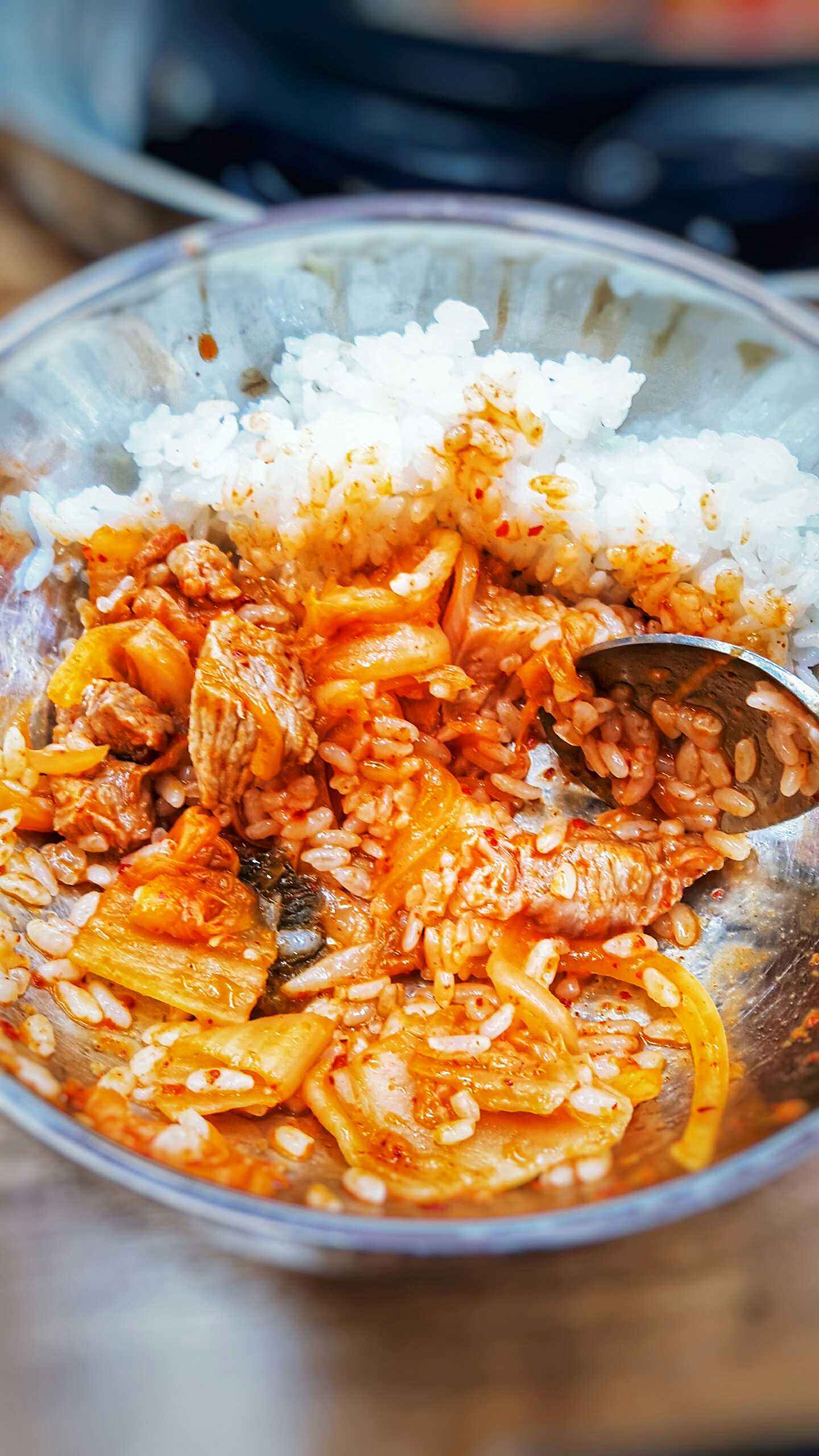 When the stew is ready to eat, mix it with rice. Rice is all-you-can-eat for free.