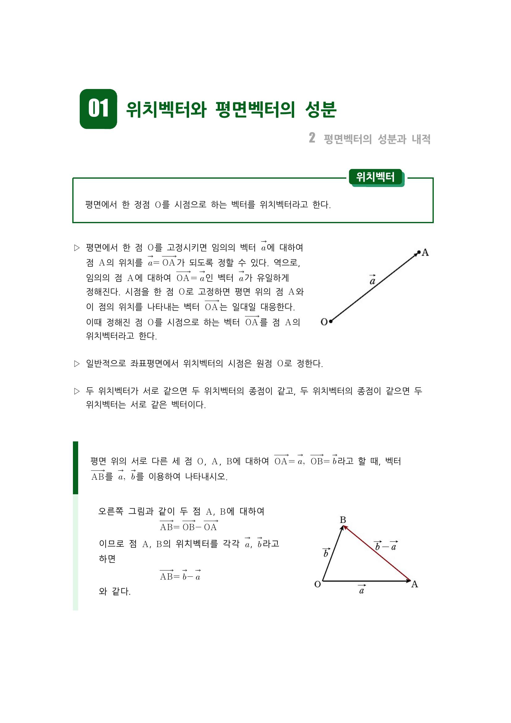 수학 개념 정리/공식 : 위치벡터, 평면벡터의 성분, 두 평면벡터가 서로 같을 조건, 평면벡터의 크기, 평면벡터의 성분에 의한 연산, 평면벡터의 성분과 크기 본문