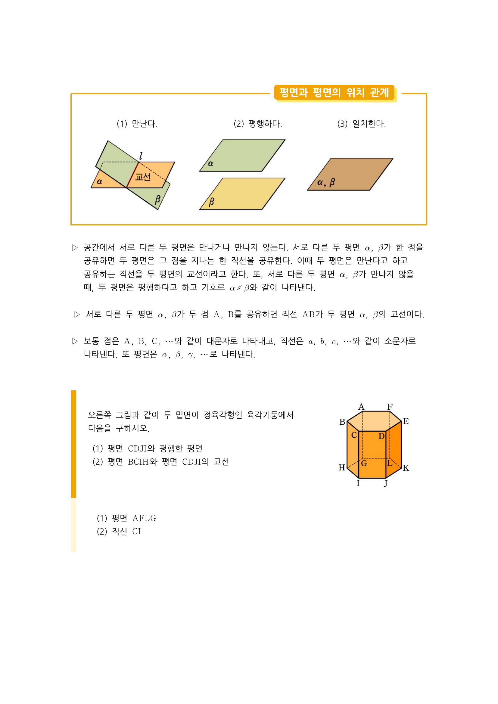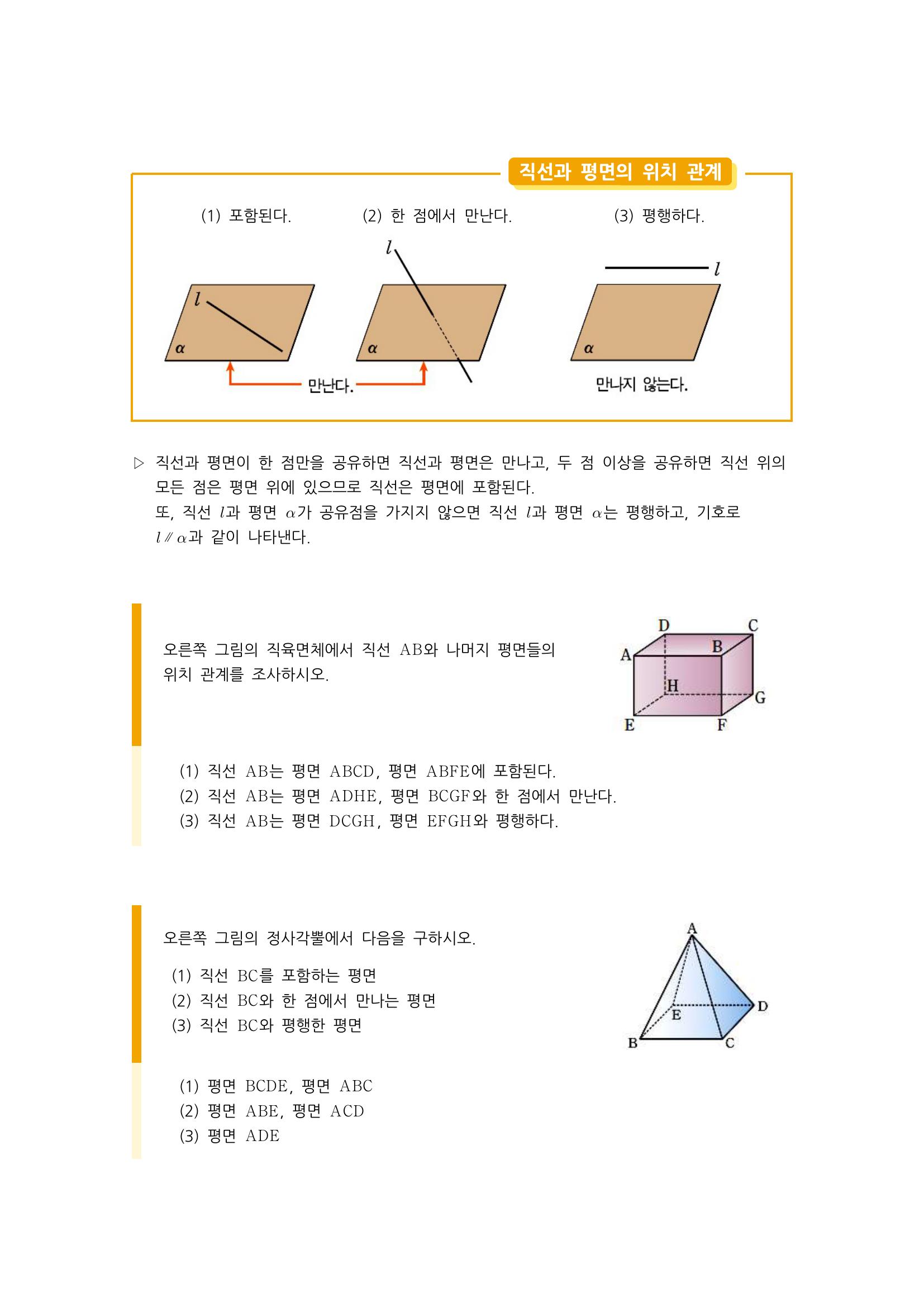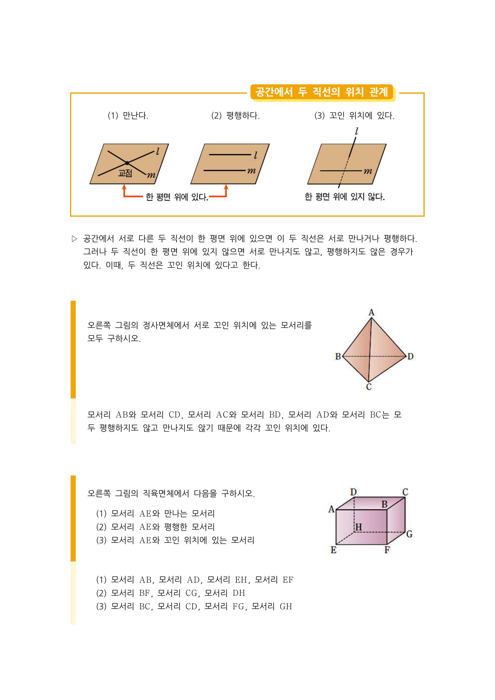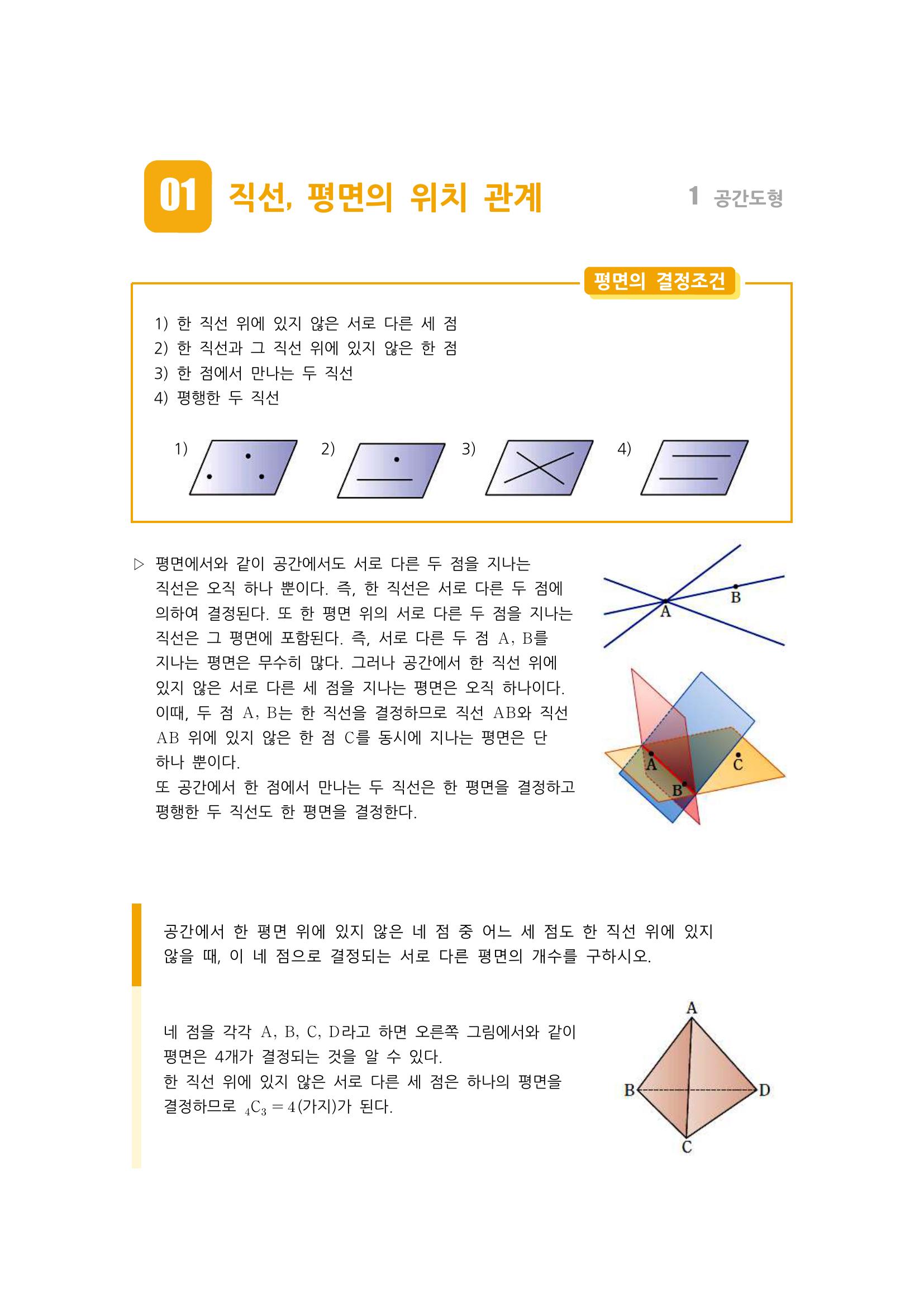 수학 개념 정리/공식 : 평면의 결정조건, 공간에서 두 직선의 위치관계(만만남, 평행, 꼬인 위치), 직선과 평면의 위치관계(포함, 한 점, 평행), 평면과 평면의 위치관계(만남, 평행, 일치) 본문
