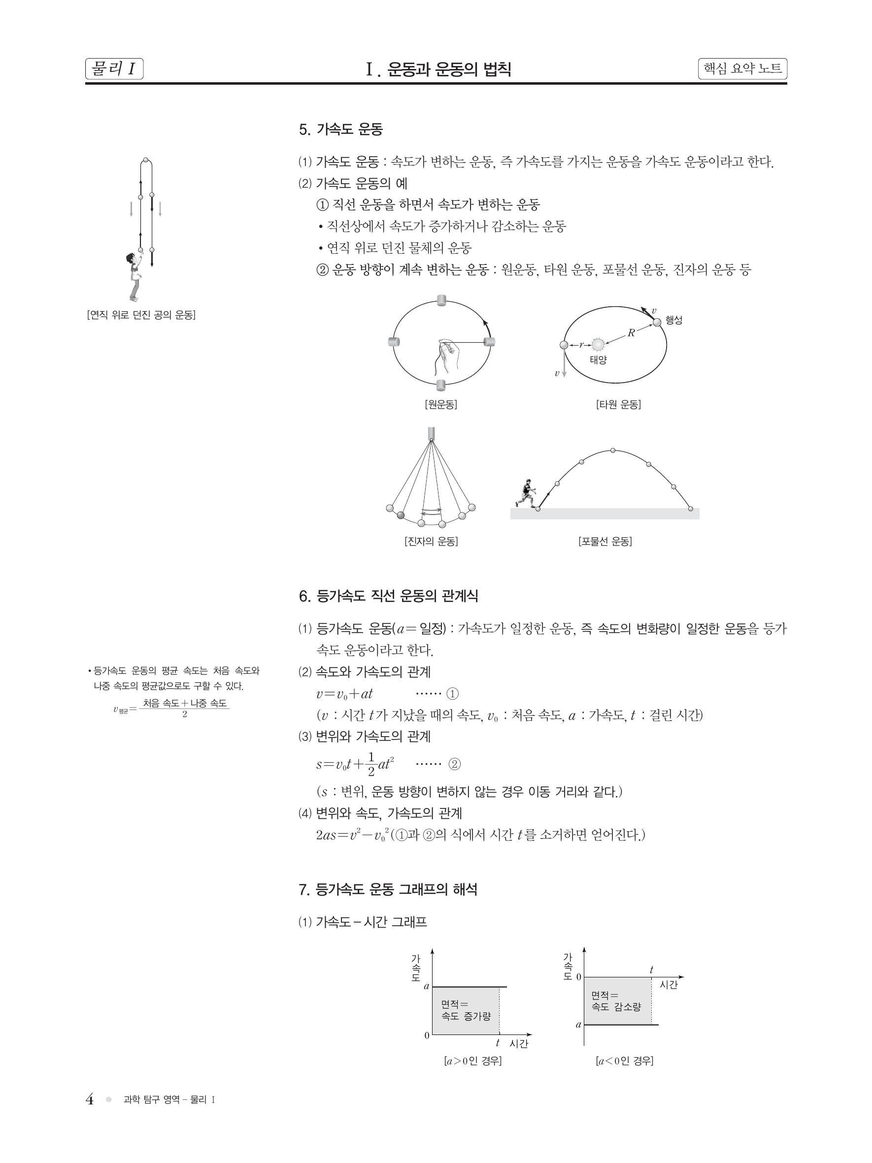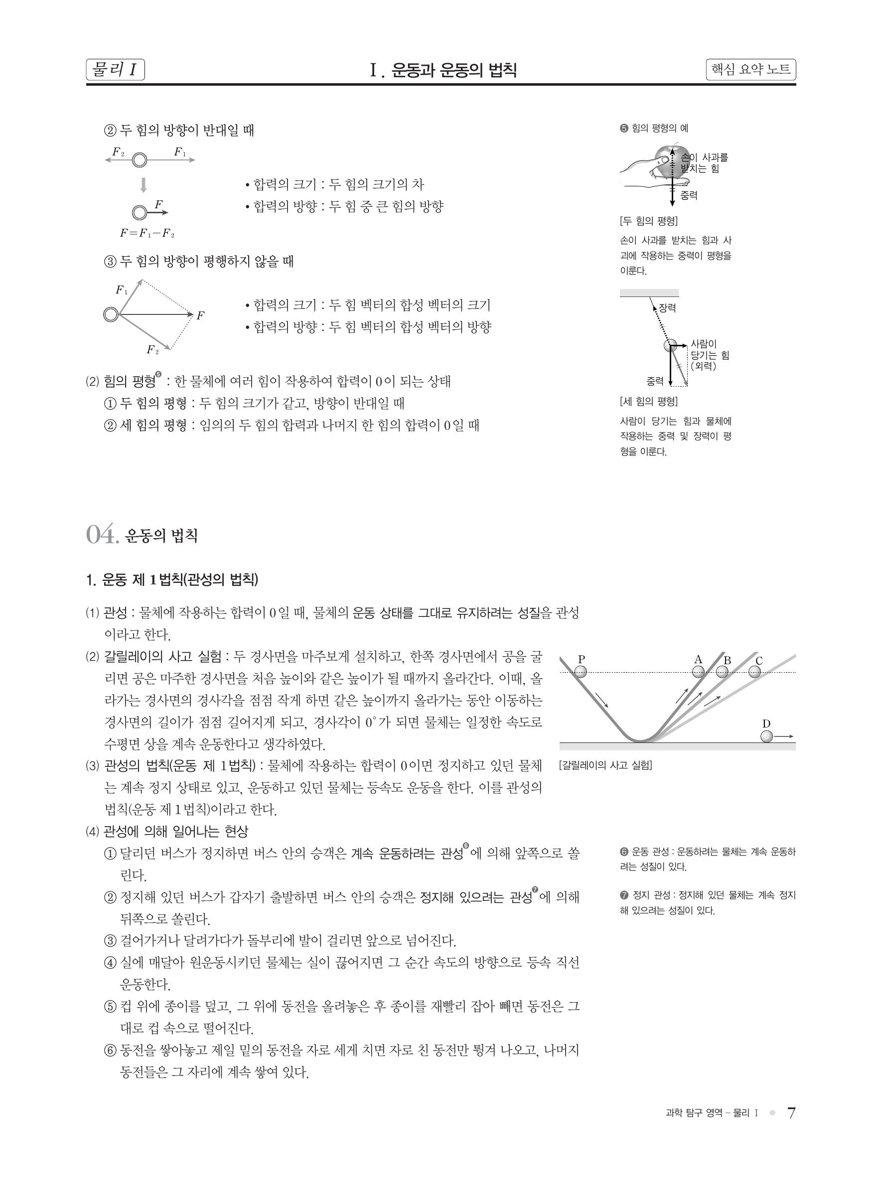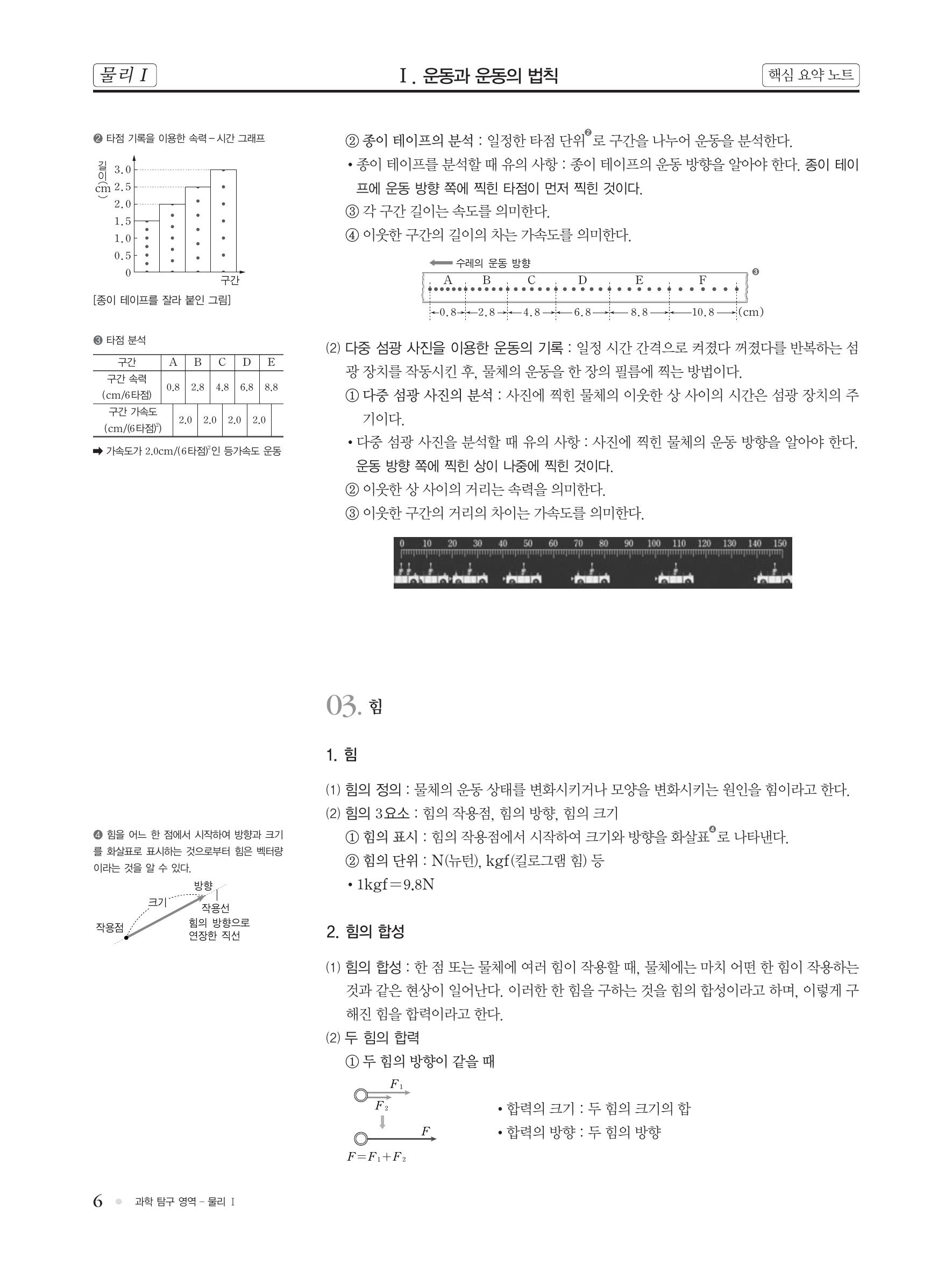 핵심 개념 : 이동 거리와 변위, 평균 속력과 순간 속력, 상대 속도, 가속도 운동, 등가속도 운동, 운동의 기록(다중 섬광 사진), 힘의 합성, 힘의 합력, 운동 제 1법칙(관성의 법칙), 운동 제 2법칙(가속도의 법칙), 운동 제 3법칙(작용/반작용의 법칙)