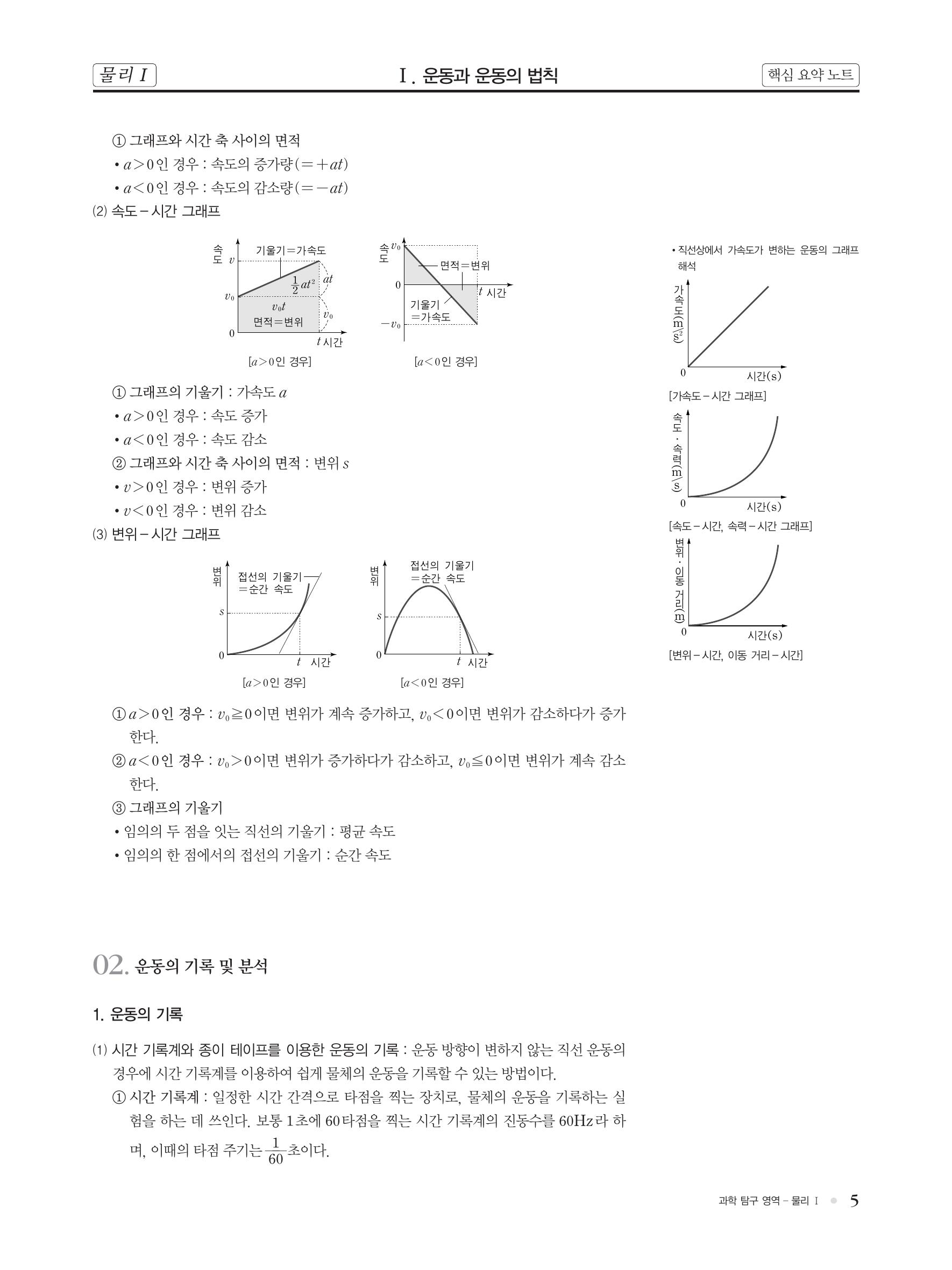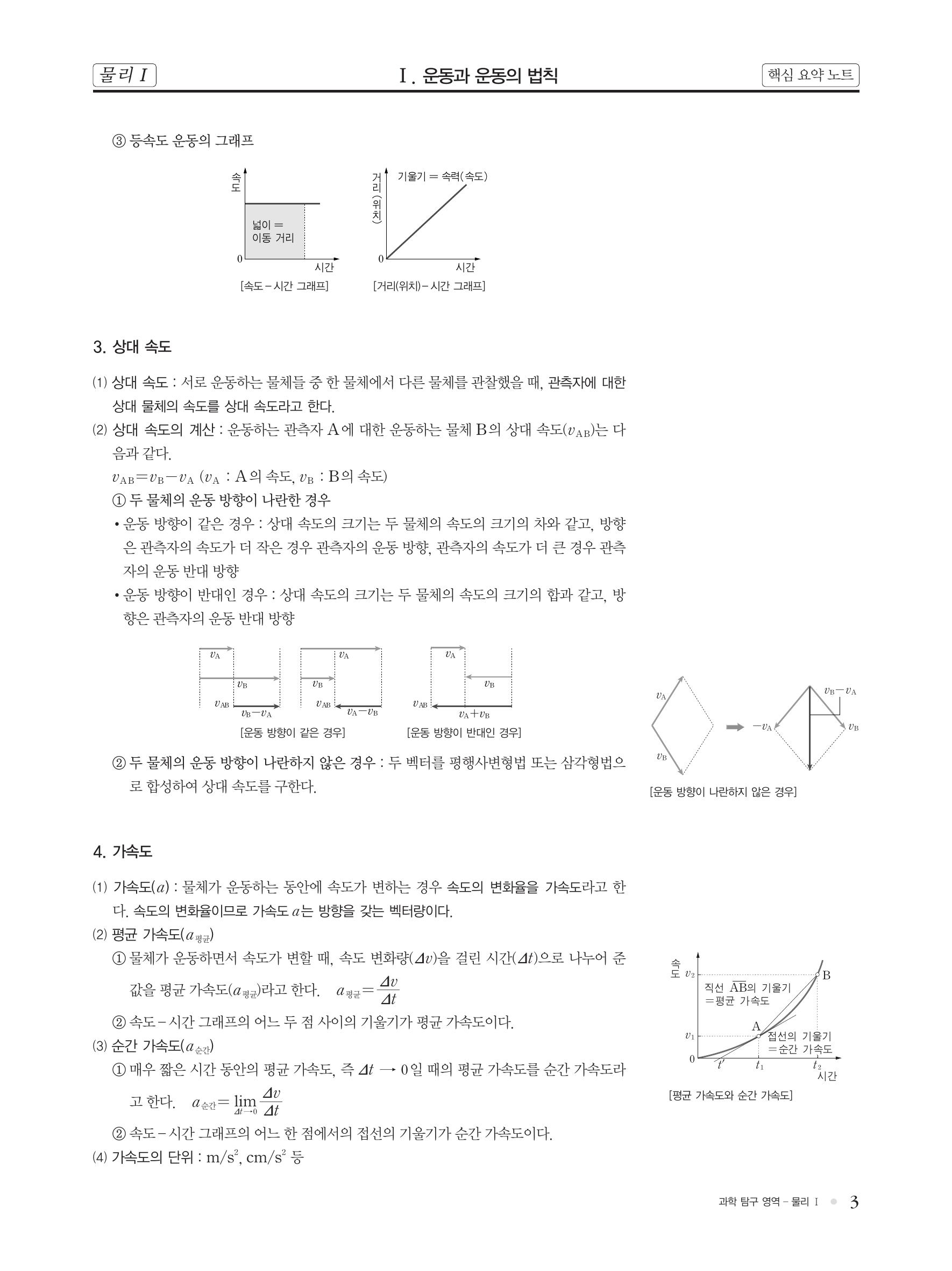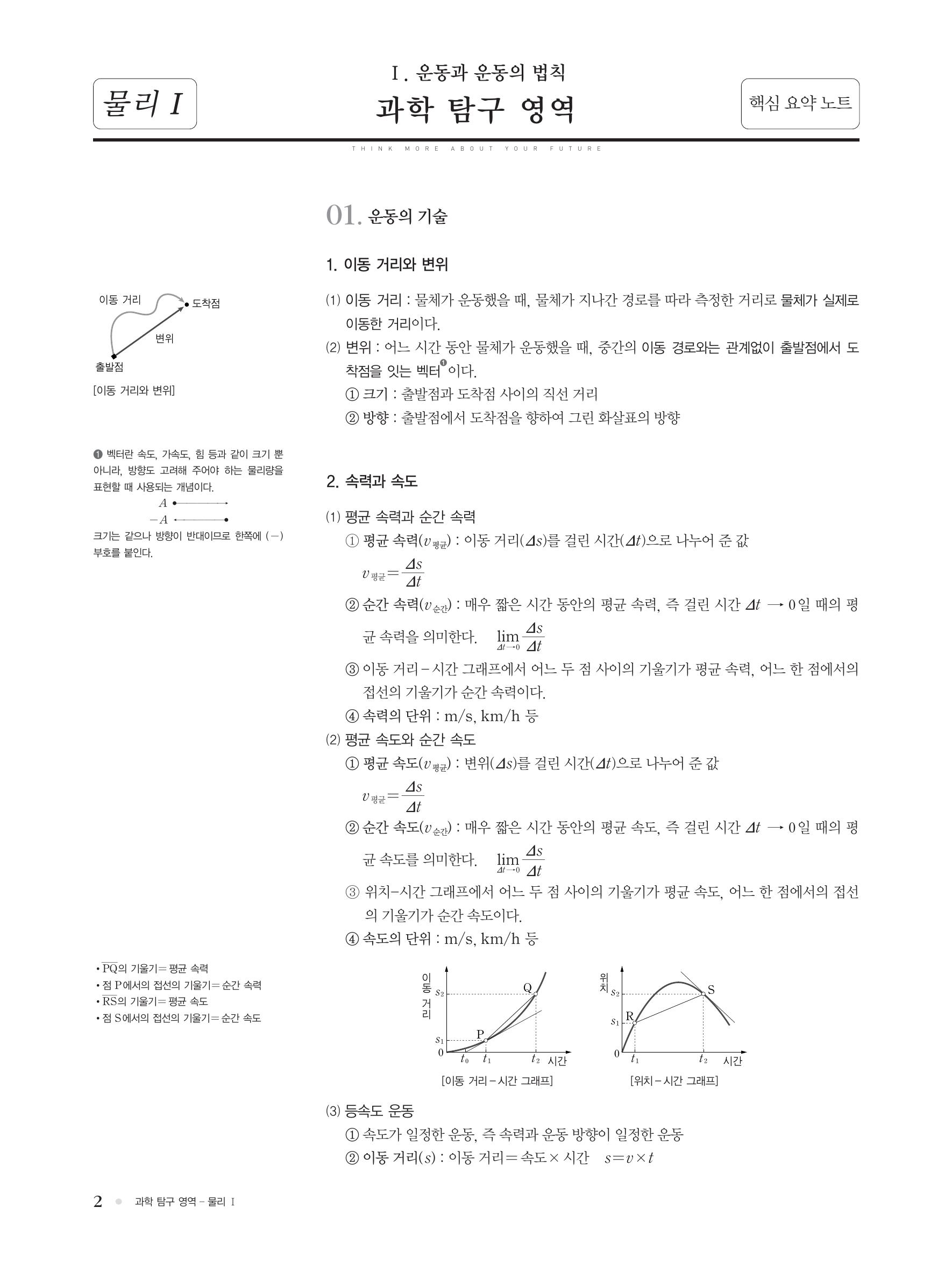 핵심 개념 : 이동 거리와 변위, 평균 속력과 순간 속력, 상대 속도, 가속도 운동, 등가속도 운동, 운동의 기록(다중 섬광 사진), 힘의 합성, 힘의 합력, 운동 제 1법칙(관성의 법칙), 운동 제 2법칙(가속도의 법칙), 운동 제 3법칙(작용/반작용의 법칙)