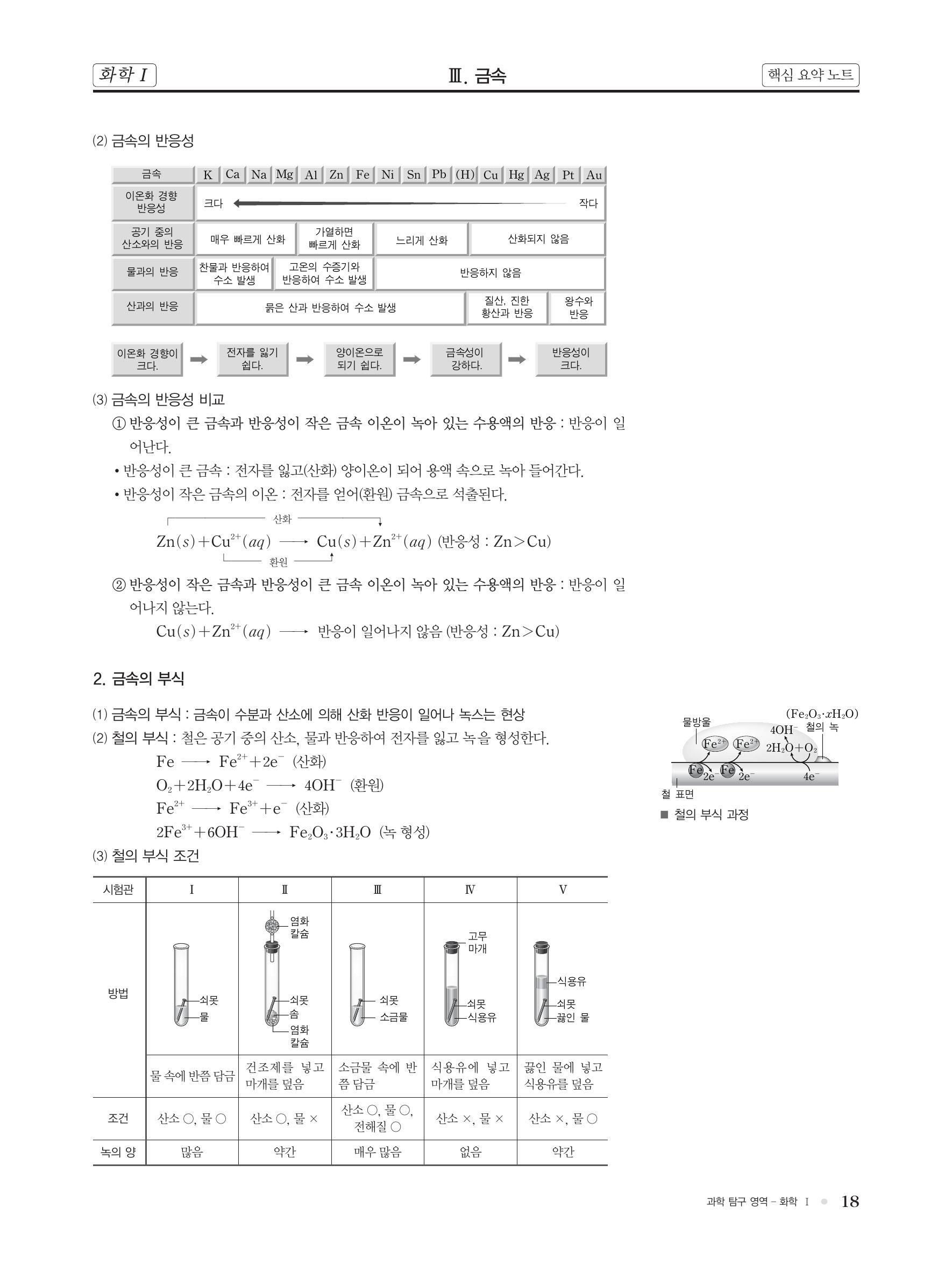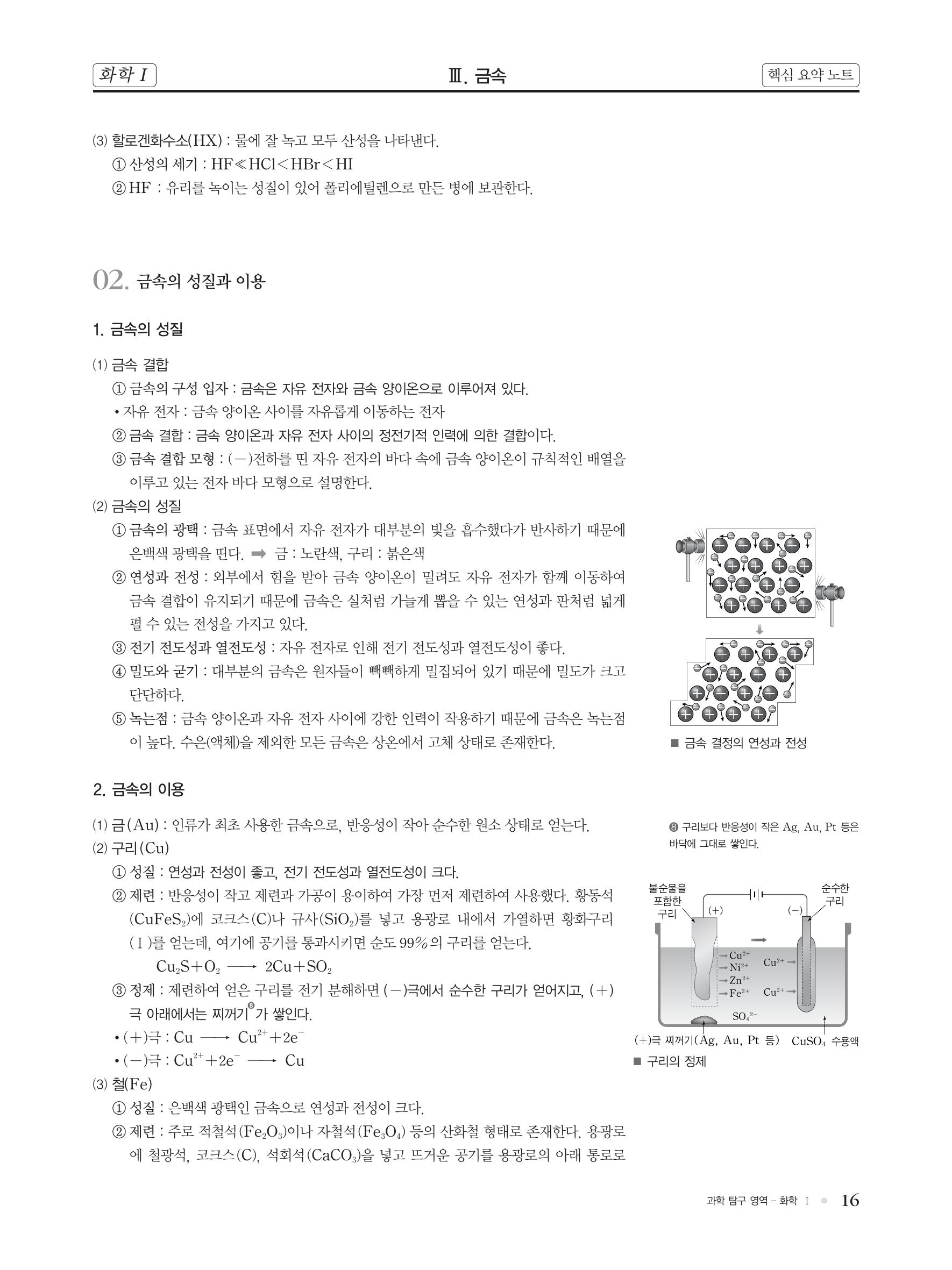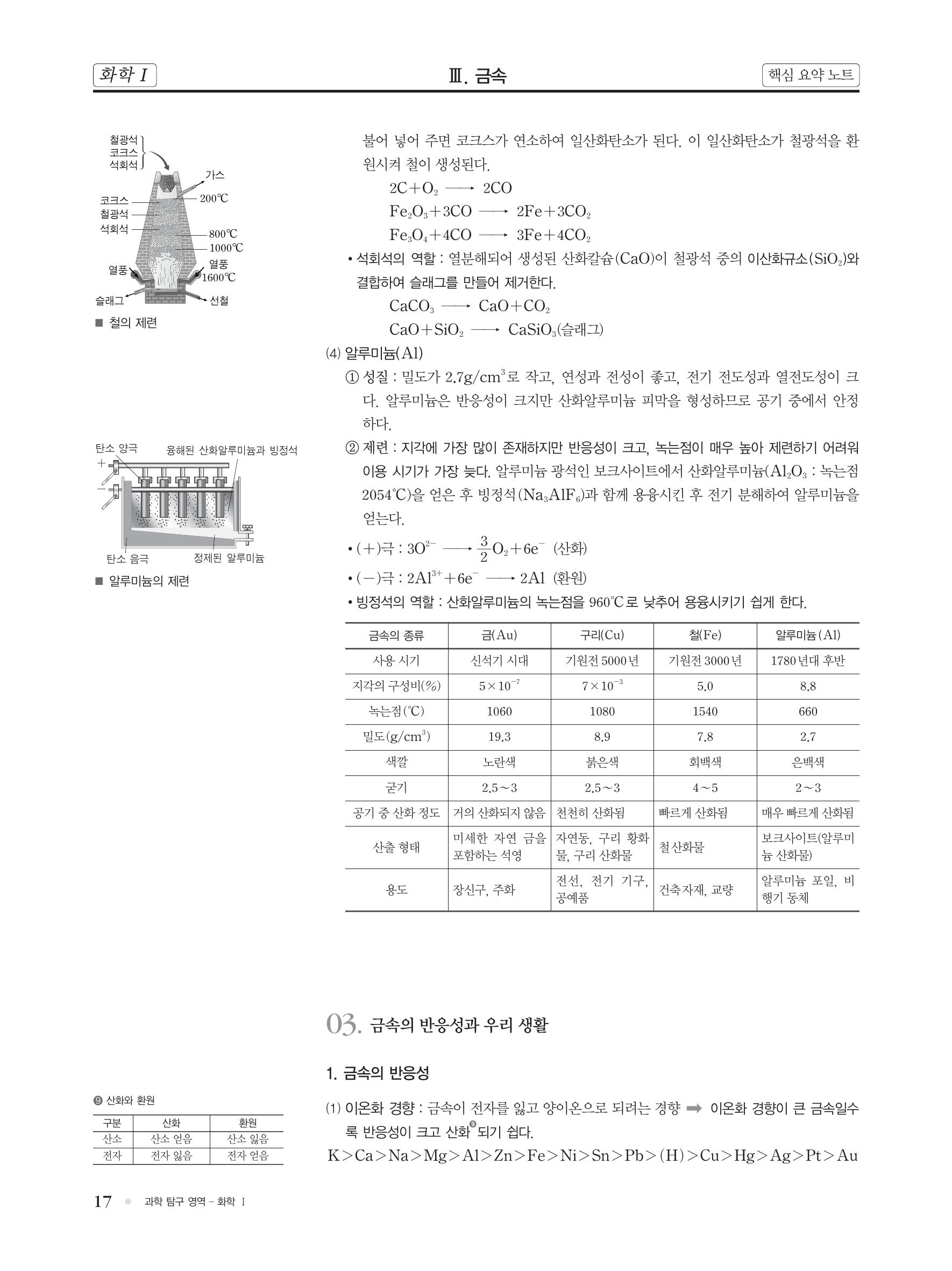화학 핵심 개념 정리 : 금속의 성질, 금속 결합, 금속의 이용(금, 구리, 철, 알루미늄, 빙정석), 금속의 반응성(이온화 경향), 금속의 부식, 철의 부식 방지(도금, 합석, 양철), 음극화 보호, 합금.. 본문