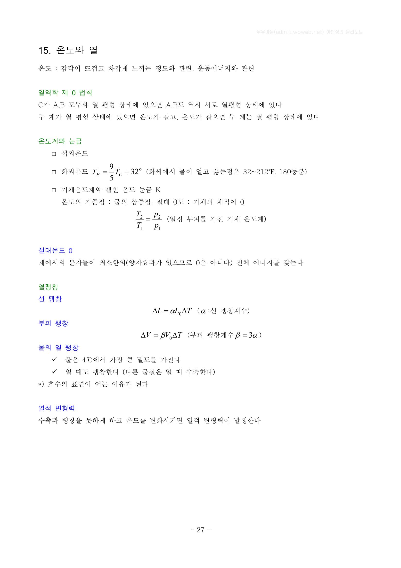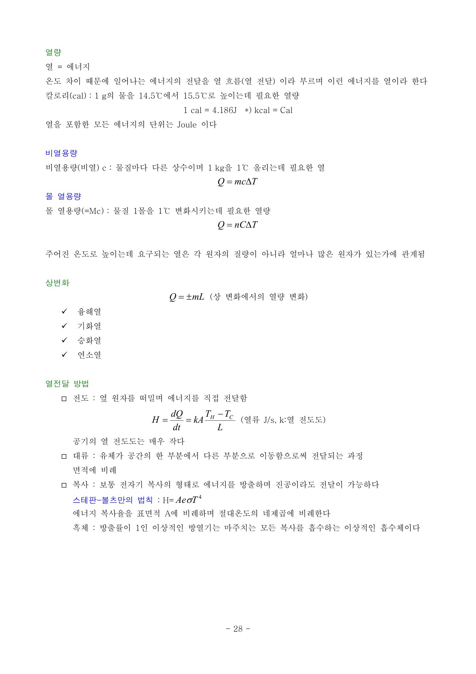 온도, 열역학 제 0법칙, 절대온도, 열팽창, 열적 변형력, 열량, 비열용량, 상변화, 열전달 방법(전도, 대류, 복사) 본문