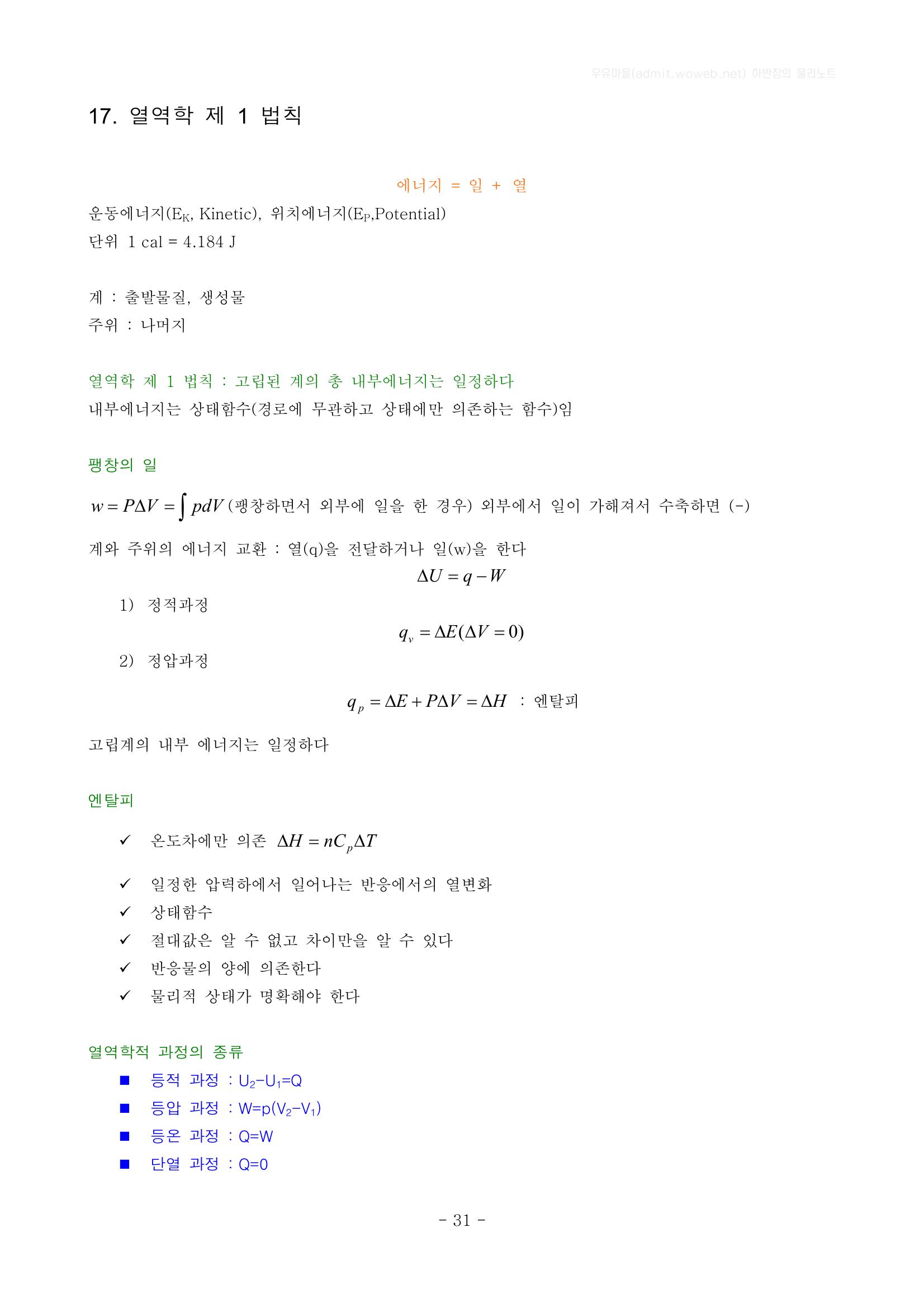 열역학 제 1법칙, 팽창의 일, 엔트로피, 열역학적 과정의 종류, 이상기체의 내부에너지, 이상기체의 단열과정 본문