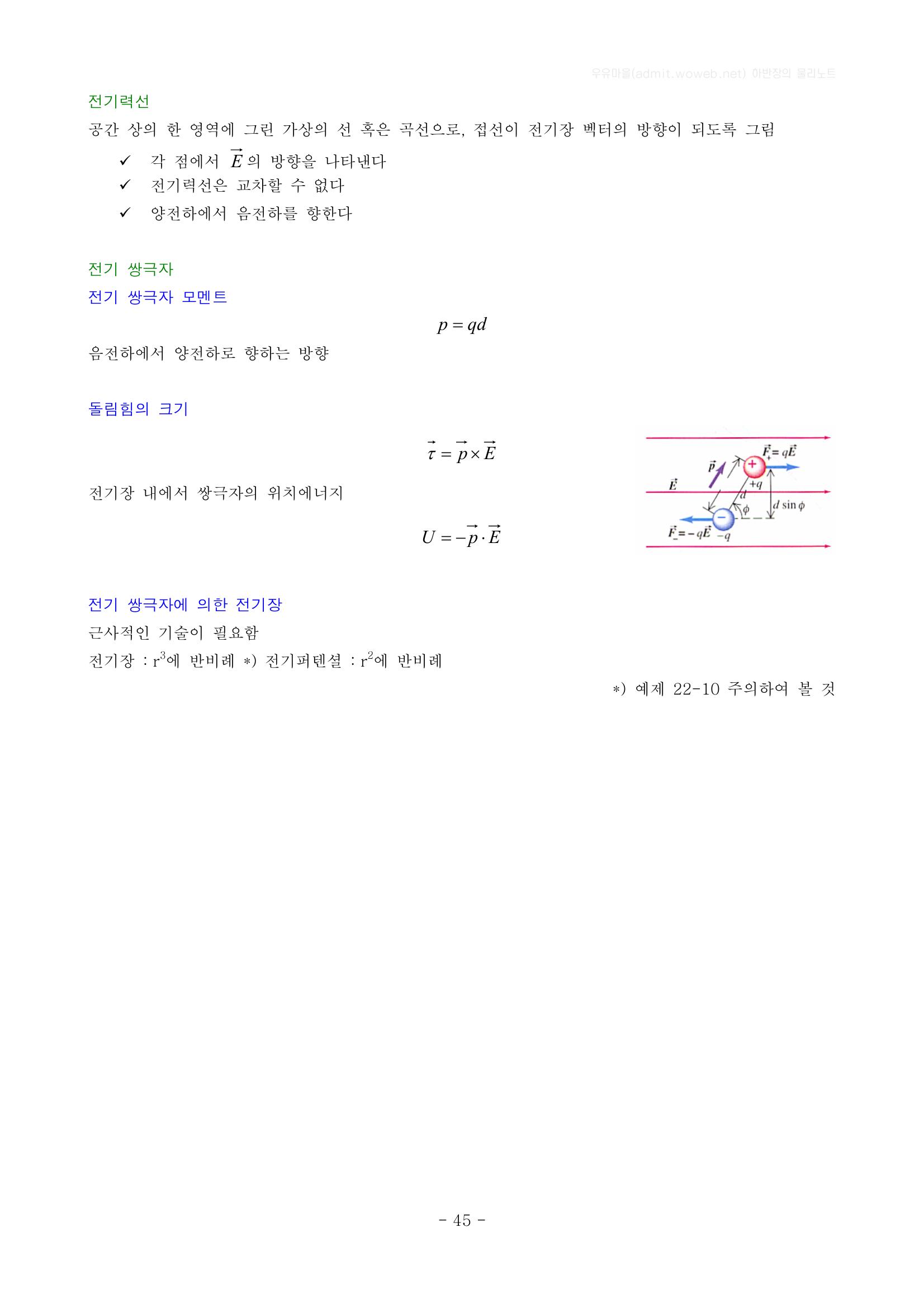 전하와 전기장, 도체, 부도체, 유도전하, 쿨롱의 법칙, 전기장 계산, 전기력선, 전기 쌍극자 모멘트 본문