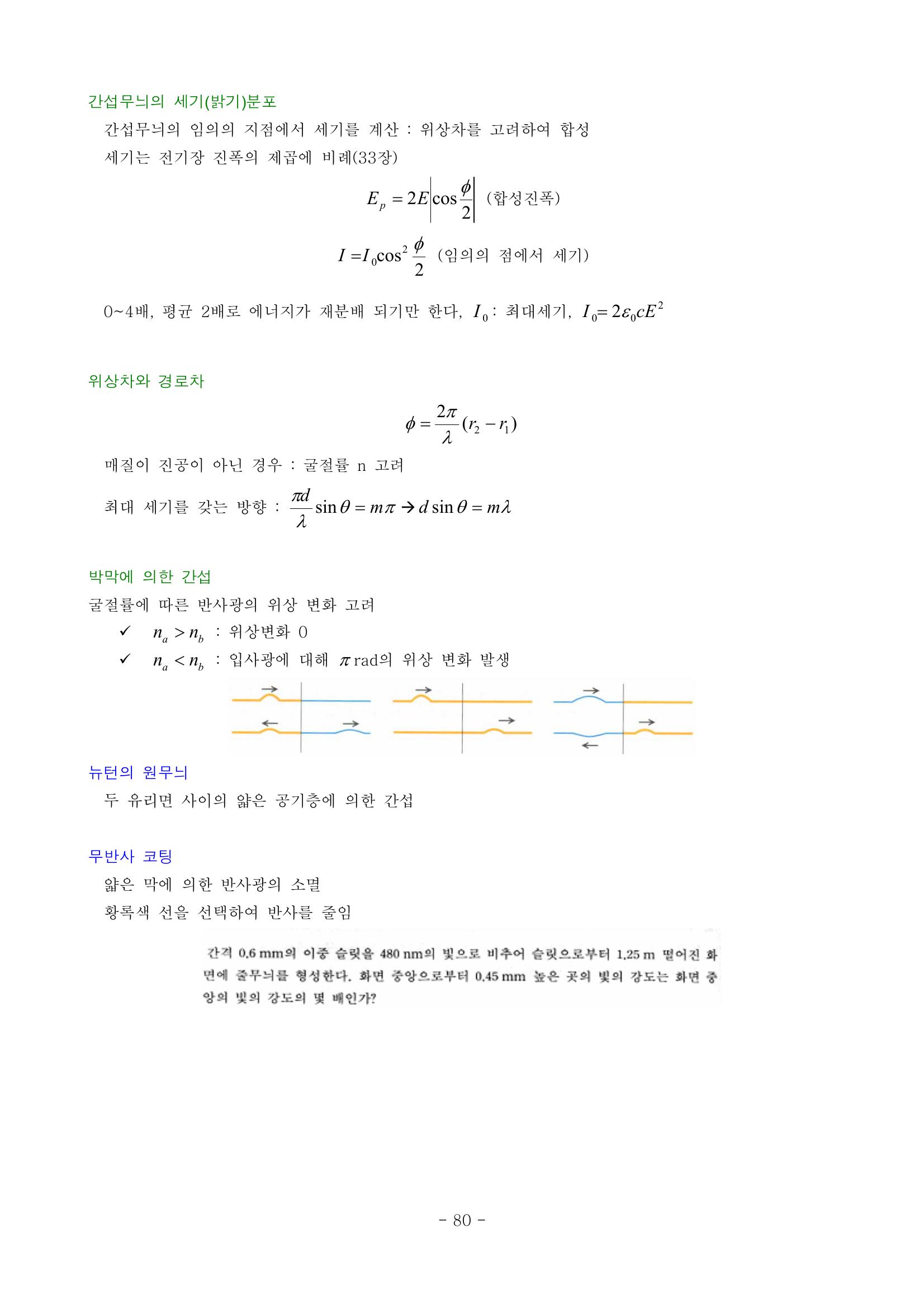 간섭, 기하광학, 물리광학, 합성파의 변위, 간섭무늬의 세기(밝기)분포, 위상차와 경로차, 박막에 의한 간섭, 뉴턴의 워누늬, 무반사 코팅, 마이켈슨 간섭계, 광자