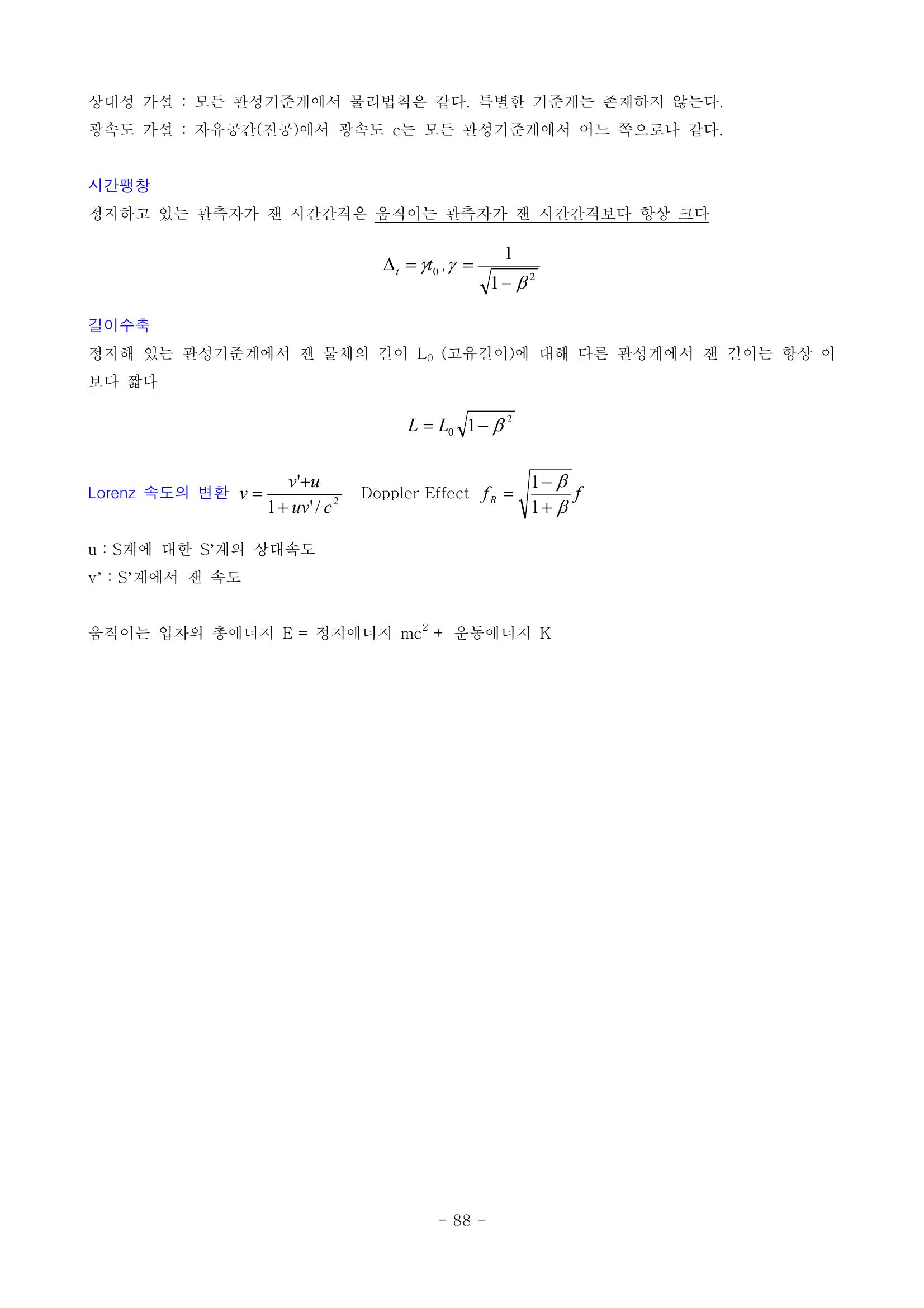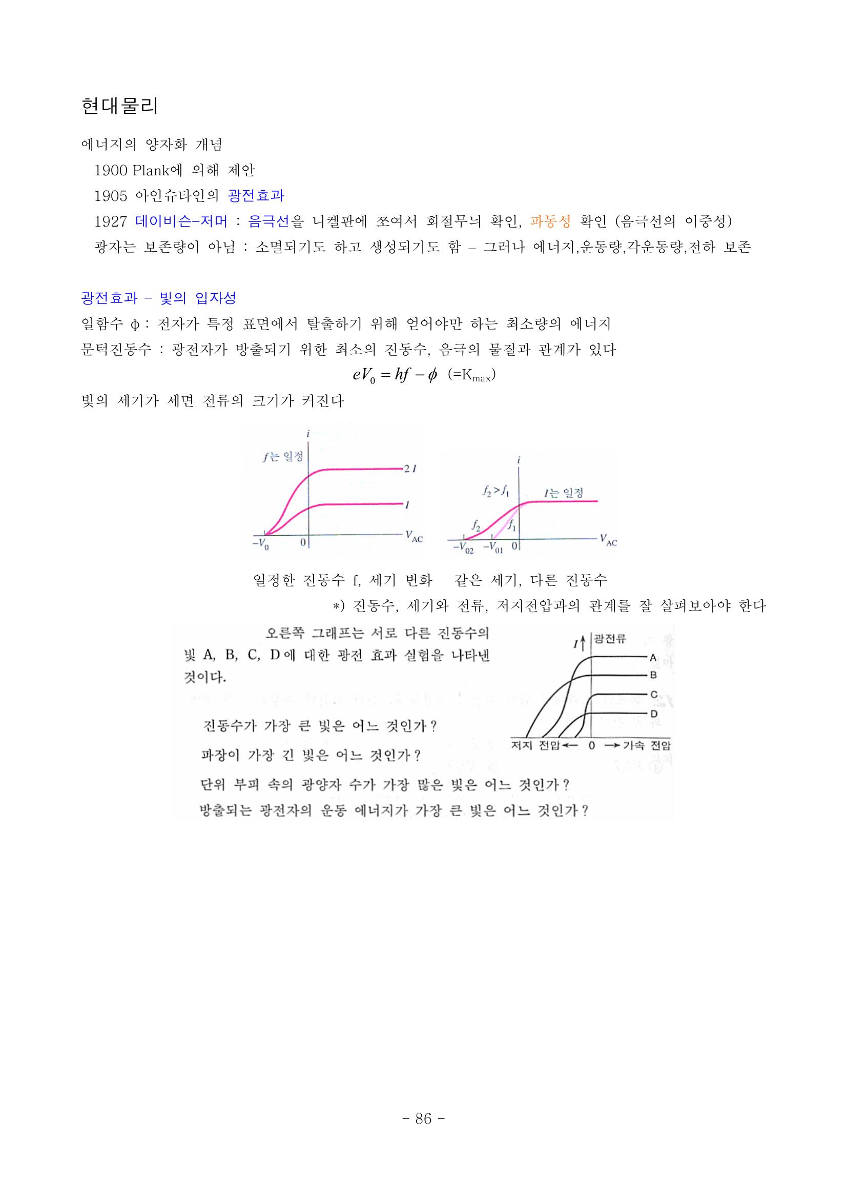 현대물리, 에너지의 양자화 개념, 광전효과(빛의 입자성), 프랑크-헤르츠의 실험, 보어모형, 콤프턴 효과, X선 스펙트럼, 상대성 가설, 시간팽창, 길이 수축, 로렌츠 속도의 변환