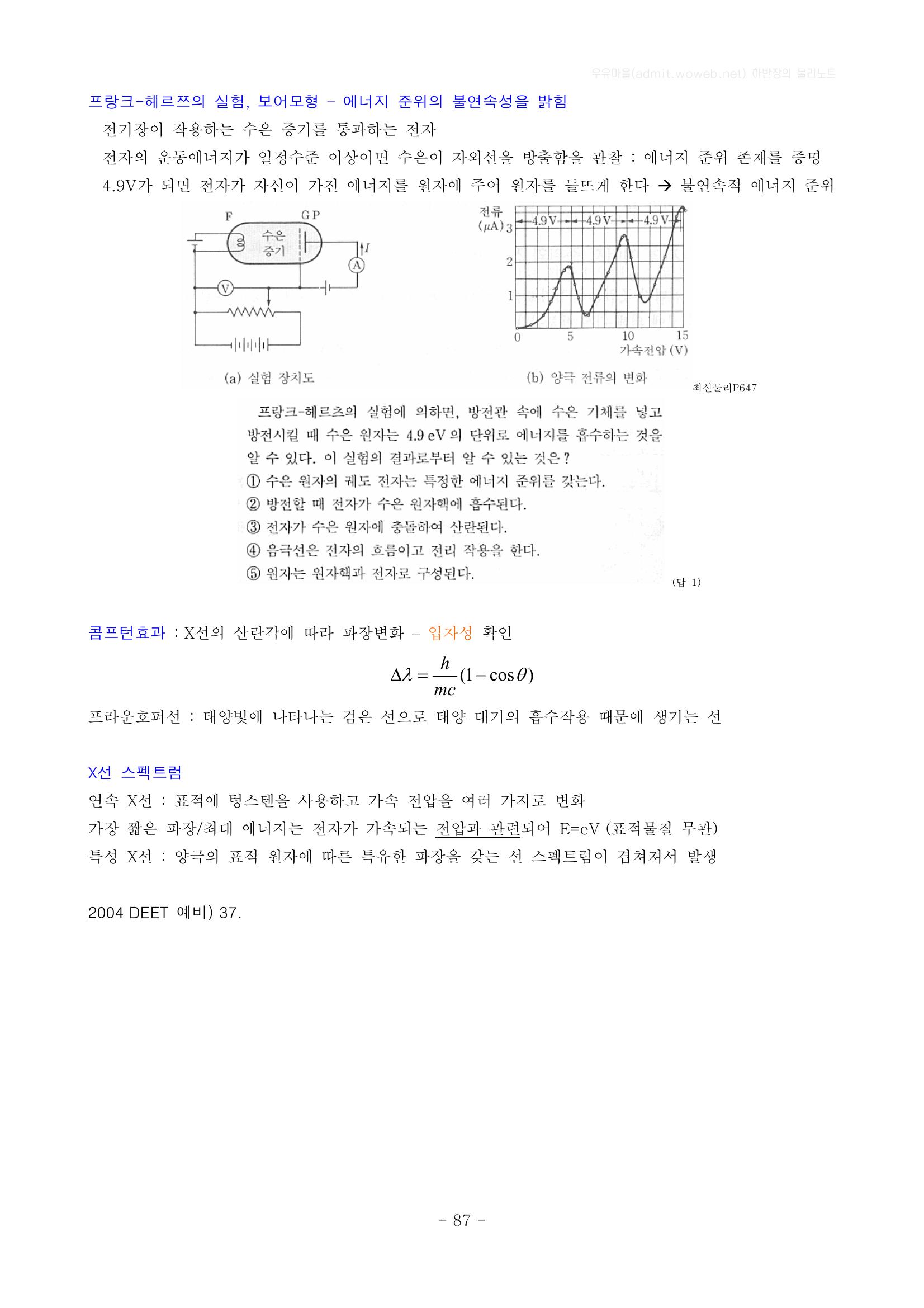 현대물리, 에너지의 양자화 개념, 광전효과(빛의 입자성), 프랑크-헤르츠의 실험, 보어모형, 콤프턴 효과, X선 스펙트럼, 상대성 가설, 시간팽창, 길이 수축, 로렌츠 속도의 변환 본문