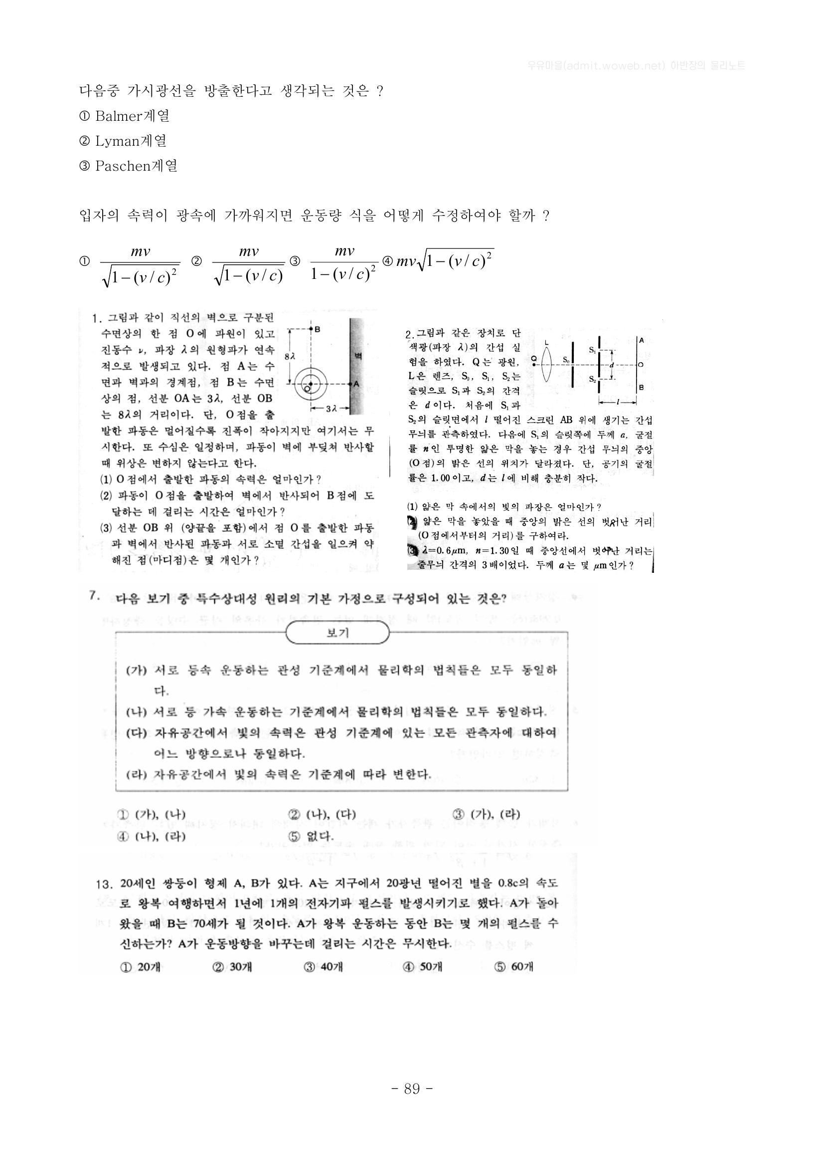 현대물리, 에너지의 양자화 개념, 광전효과(빛의 입자성), 프랑크-헤르츠의 실험, 보어모형, 콤프턴 효과, X선 스펙트럼, 상대성 가설, 시간팽창, 길이 수축, 로렌츠 속도의 변환 본문