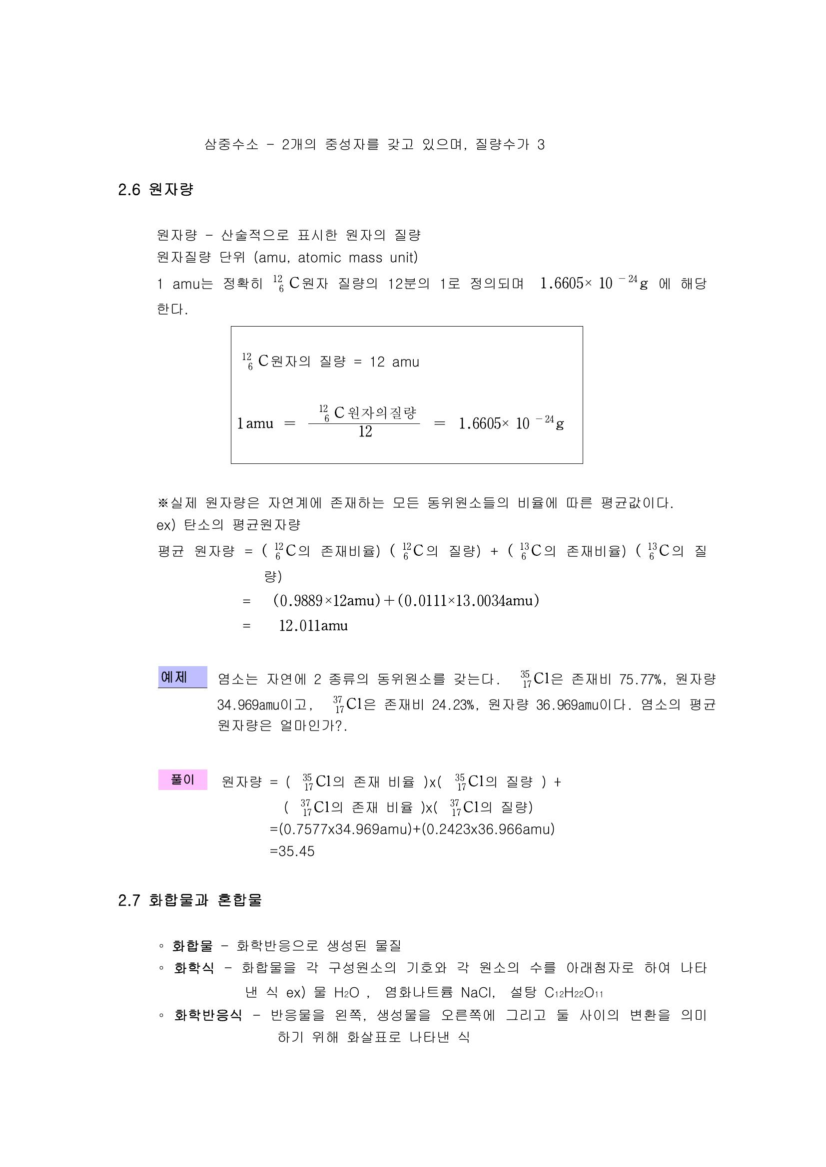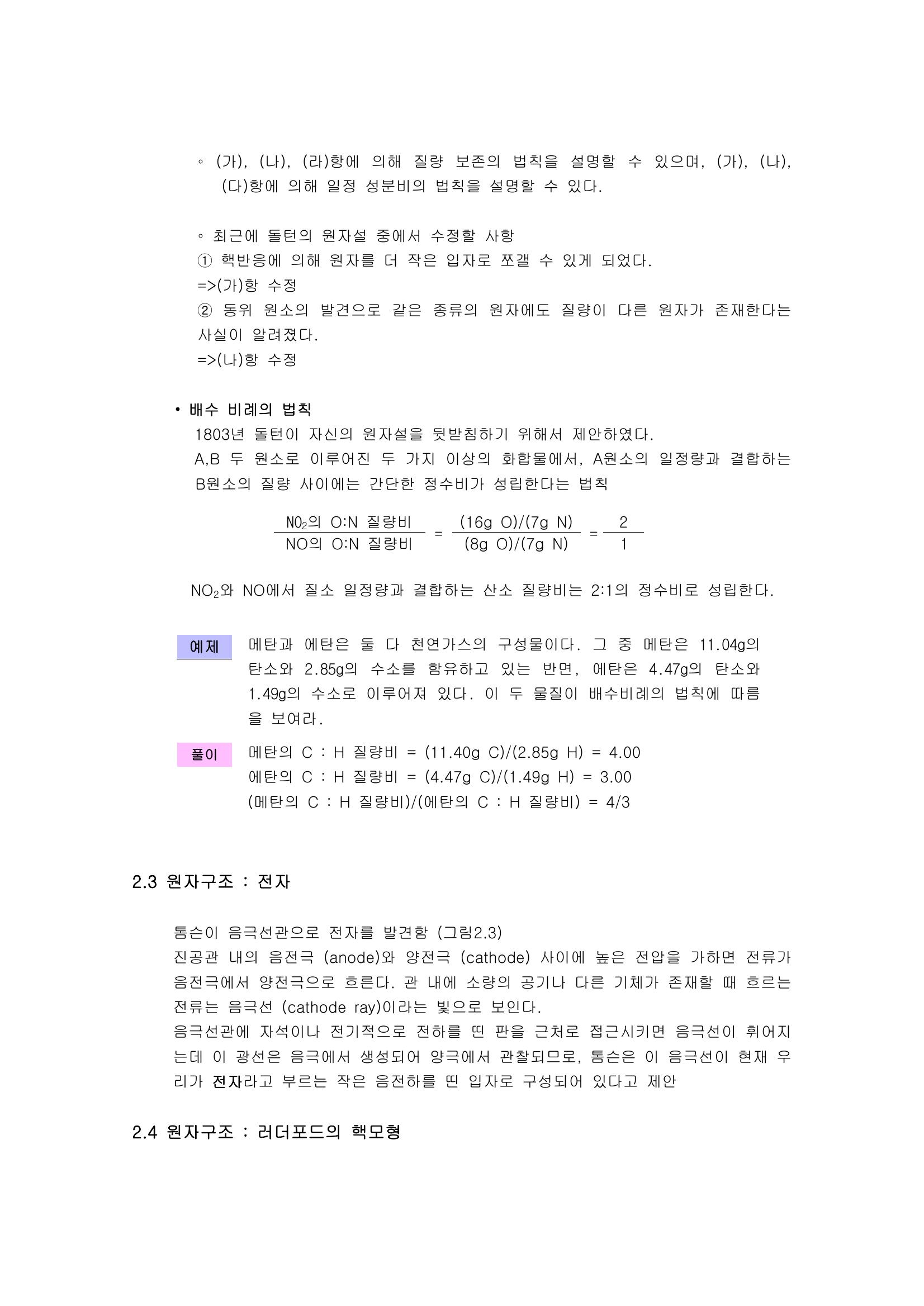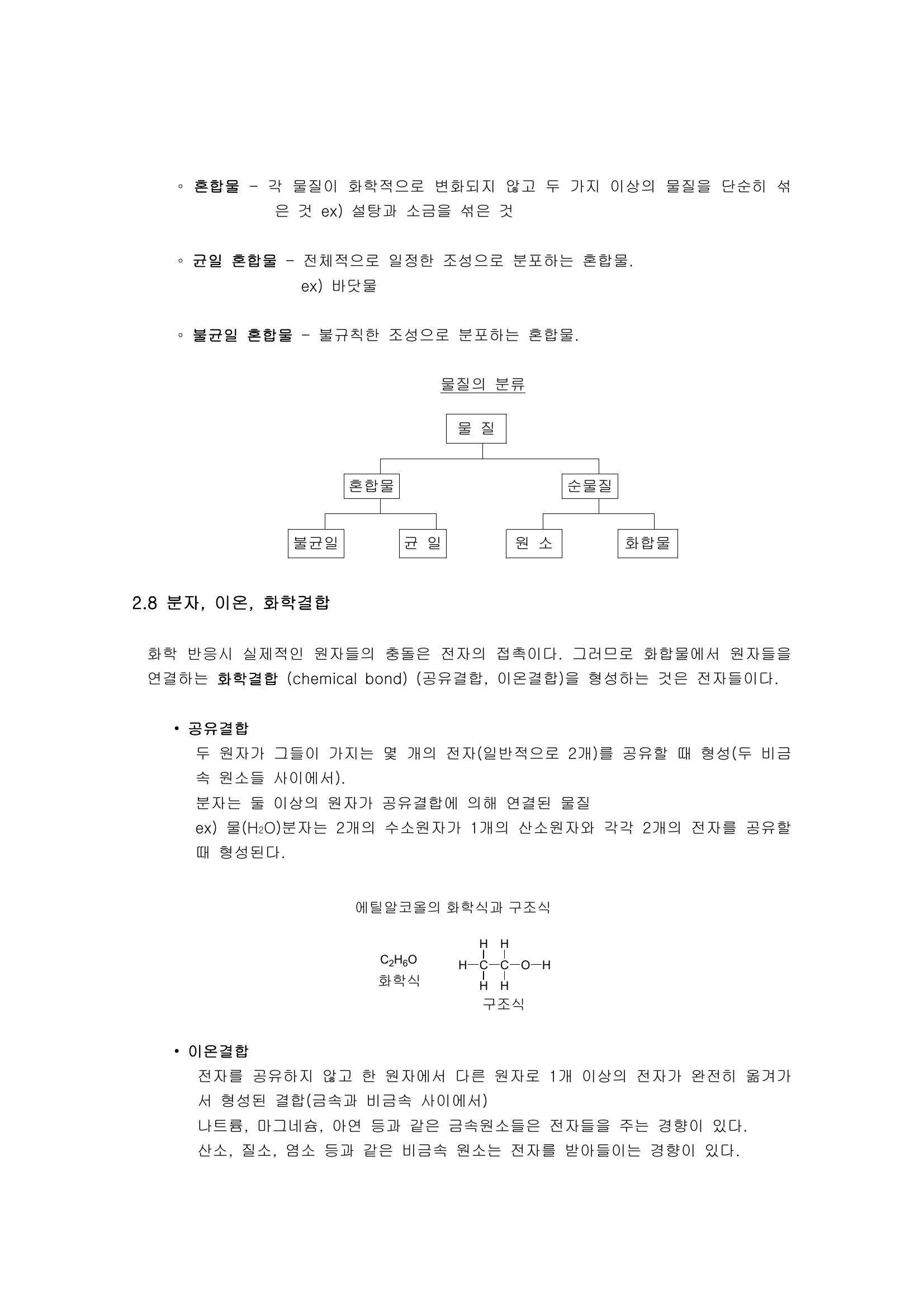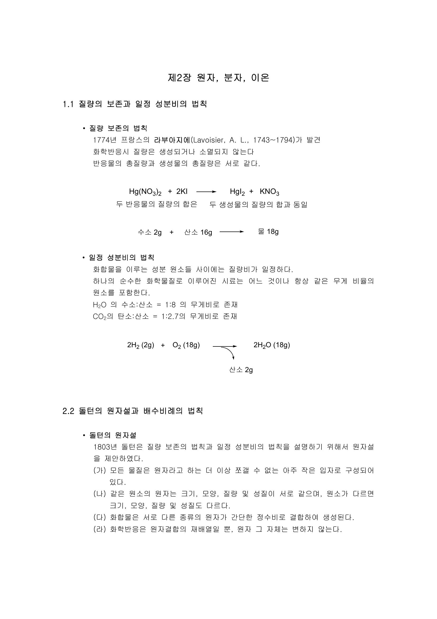 원자, 분자, 이온 : 질량의 보존, 돌턴의 원자설과 배수비례의 법칙, 원자구조, 러더포드의 핵모형, 양성자와 중성자, 원자량, 화합물과 혼합물, 공유결합, 이온결합, 산과 염기 본문