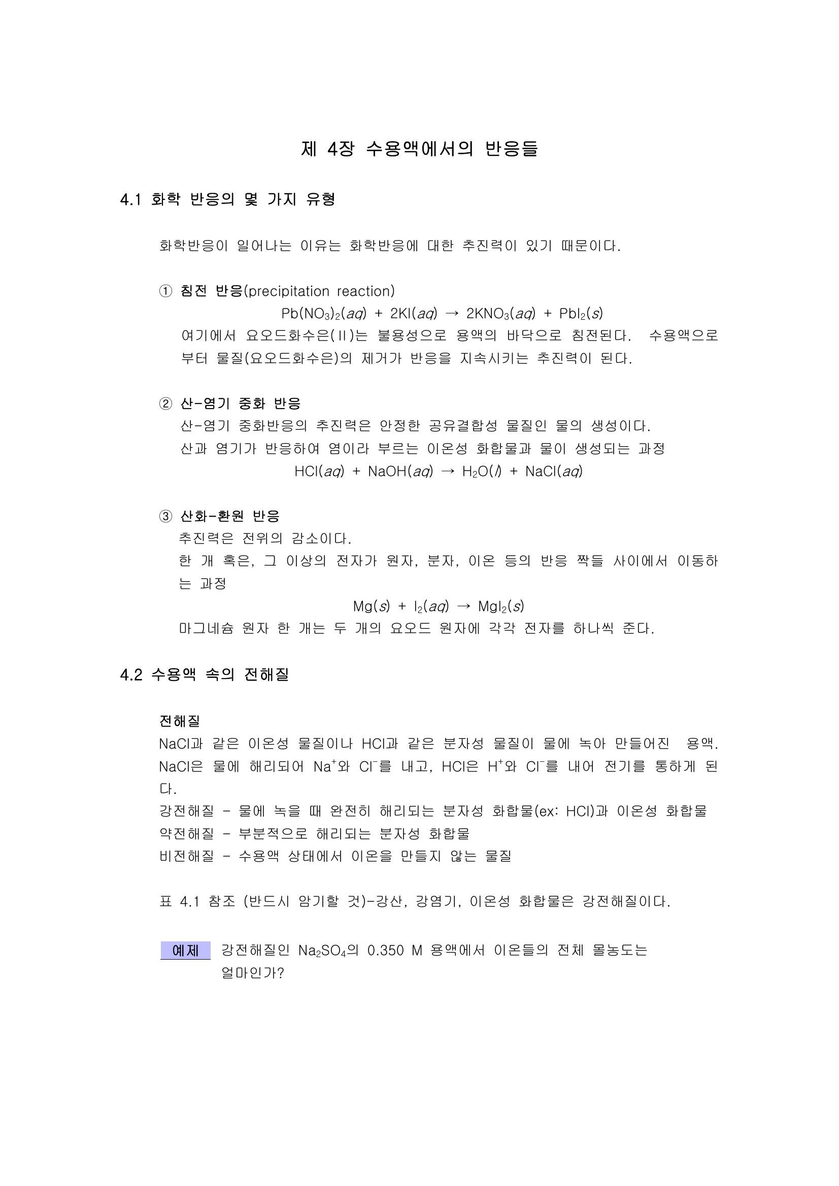 수용액에서의 반응들 : 침전 반응, 산-염기 중화 반응, 산화/환원 반응, 전해질, 분자 반응식, 이온 반응식, 알짜 이온 반응식, 잘 녹는 물질들, 아레니우스의 산, 염기, 활동도 서열, 산화수법에..