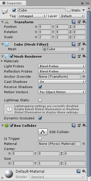 인스펙터 창에는 다음과 같은 컴포넌트가 추가되어 있다. (기본 Cube 게임 오브젝트로 설명)