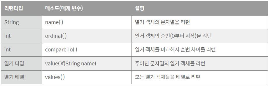 메소드는 java.lang.Enum 클래스에 선언된 메소드인데, 모든 열거 타입은 컴파일 시에 Enum 클래스를 상속하게 되어 있기 때문에, 다음과 같은 메소드를 사용 가능하다.