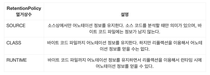 어노테이션 정의시 사용 용도에 따라 어느 범위까지 유지할 것인지 지정해야 한다. 즉 소스상에만 유지하는지, 컴파일된 클래스까지 유지하는지, 런타임 시에도 유지할 것인지를 지정해야 한다. 어노테이션 유지 정책은 java.lang.annotation.RetentionPolicy 열거 상수로 다음과 같이 정의되어 있다.