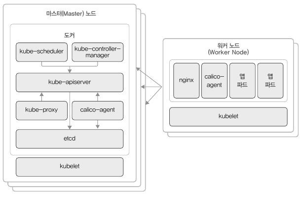 워커 노드는 애플리케이션의 구성요소인 파드를 호스트한다. 컨트롤 플레인은 워커 노드와 클러스터 내 파드를 관리한다. 프로덕션 환경에서는 일반적으로 컨트롤 플레인이 여러 컴퓨터에 걸쳐 실행되고, 클러스터는 일반적으로 여러 노드를 실행하므로 내결함성과 고가용성이 제공된다.
