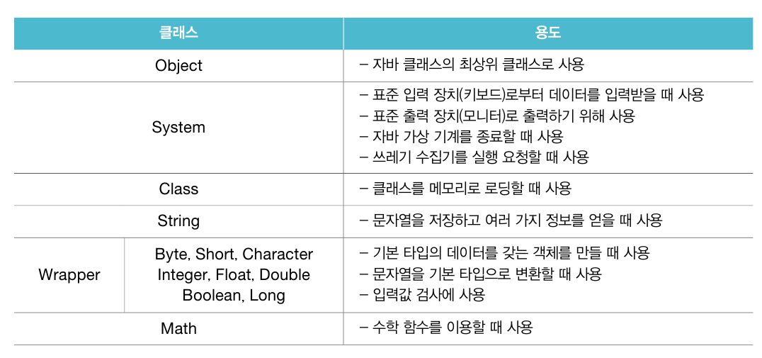 자바는 C++에 비해 API 사용이 더 수월한 편이다. 먼저 java.lang 패키지에 속하는 주요 클래스와 간략한 용도를 찾아보자.