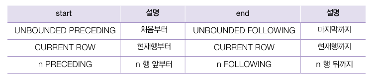 -- ROWS BETWEEN 숫자 PRECEDING AND 숫자 FOLLOWING으로 위아래 행 범위를 지정할 수 있다