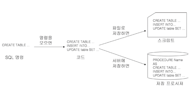 SQL 명령 열개를 모으면 코드가 되며, 이를 텍스트로 저장하면 스크리트, 서버에 저장하면 저장 프로시져가 된다.