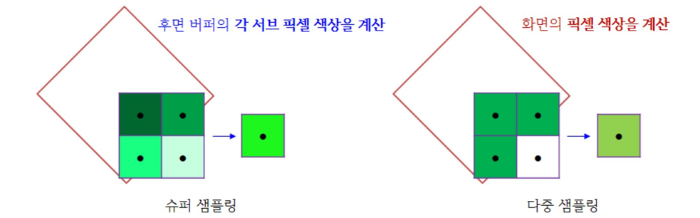 초과표본화 : 초과표본화에서는 버퍼를 화면 해상도의 4배씩 잡고, 한 픽셀을 부분 픽셀로 나누어 계산한 후, 화면에 presenting 하는 과정에서 후면 버퍼를 원래 크기의 버퍼로 환원(resolving)한다. 이를 하향표본화(Downsampling)이라고 한다. 이는 소프트웨어 단에서의 처리량이 크다.