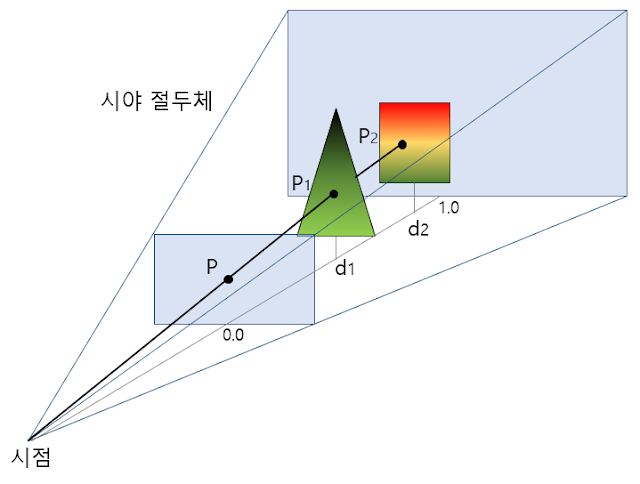 깊이 값이 작은 녀석이 실제로 후면 버퍼와 깊이 버퍼에 기록되고 후에 렌더링된다!