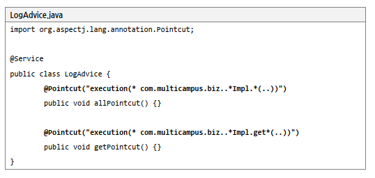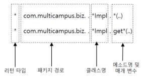 포인트컷은 <aop:pointcut> 엘리멘트로 유일한 문자열로 선언한다. 중요한 것은 expression 속성인데, 이 속성 값을 어떻게 설정하느냐에 따라 필터링 되는 메소드가 달라진다.