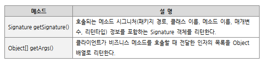 스프링에서는 JoinPoint 인터페이스를 이용해 비즈니스 메소드에 관한 정보를 알 수 있게 도와준다.