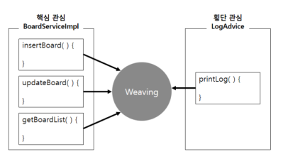포인트컷으로 지정한 핵심 관심 메소드가 호출될 때, 어드바이스에 해당하는 횡단관심 메소드가 삽입되는 과정을 의미.