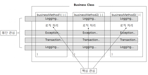 관심분리 : 횡단관심(Crossing Concerns), 핵심 관심(Core Concerns)