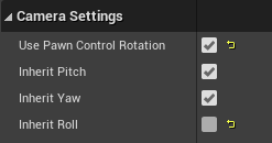 그리고 SpringArm에서 CameraSettings 에서 Use Pawn Control Rotation를 체크하고 Inherit Roll을 해제한다.