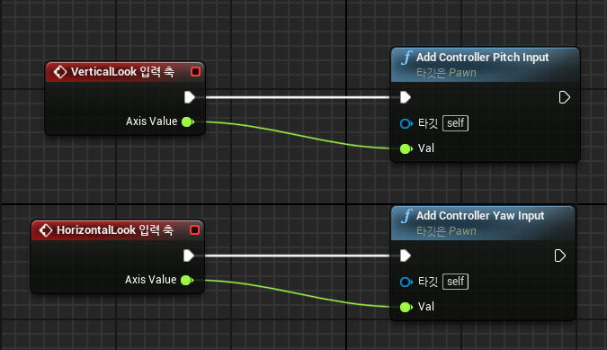 축 매핑에 위와 같이 VerticalLook과 HorizontalLook을 만들어 준 다음, Player를 컨트롤하는 BP_Player를 열어 이벤트 그래프를 다음과 같이 구성한다.