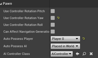 그후, BP_Player(셀프, 플레이어의 블루프린트 클래스이다)의 속성에서 Pawn -> Use Controller Rotation Yaw 체크박스 해제, Auto Possess Player에 Player0을 지정한다. Player0을 지정함으로써 현재 캐릭터가 메인 플레이어임을 명시하는 것이다.