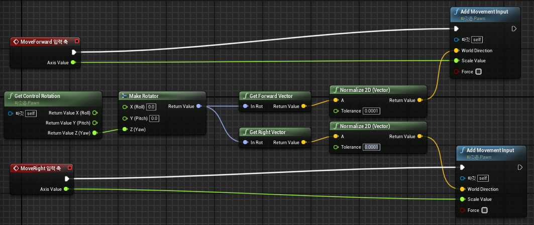 방향 벡터를 추출하고, Normalize를 해 준 뒤, Add MovementInput과 연결시키면 끝.