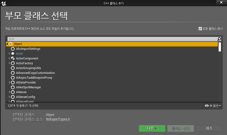 먼저, 가장 기본적인 C++ 클래스를 만들어 보자. 파일->New C++ Class를 선택하고, 모든 클래스를 표시한 뒤 Object를 선택한다.