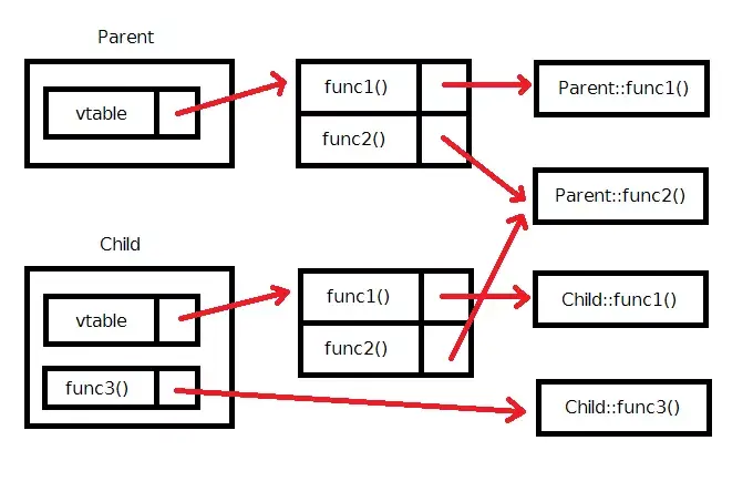 p의 경우, func1이 가상함수이므로, 가상함수 테이블을 한 번 더 참조하여 Parent::func1()을 호출하게 되고, c의 경우에도 마찬가지로 가상함수 테이블을 참조하여 Child::func1()을 호출하게 된다. 이는 오버헤드가 추가되는 것을 의미하므로, C++의 멤버 함수는 디폴트로 가상함수가 되도록 만들어지지 않은 것이다!