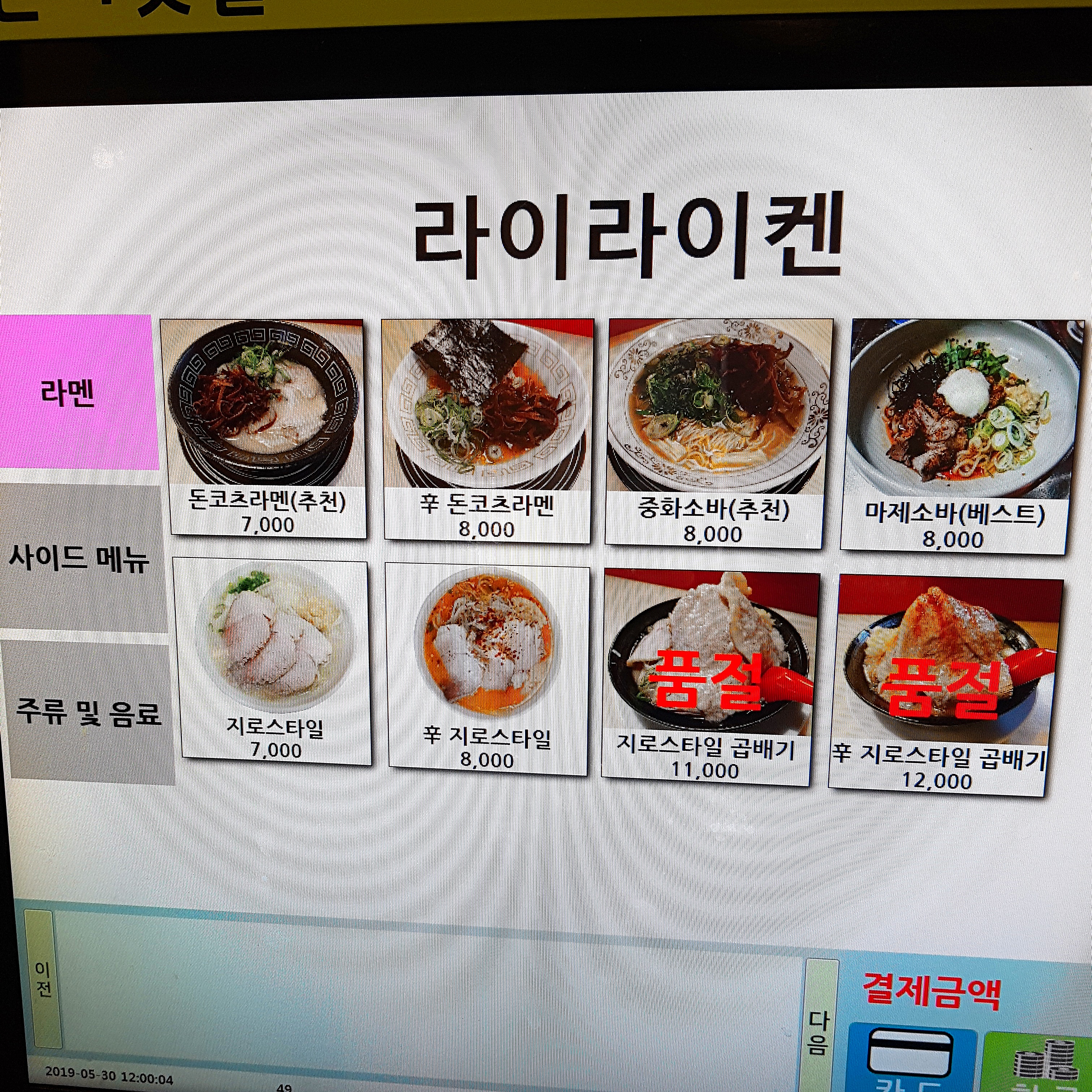 This is '辛 지로스타일 라멘', spicy version of ramen, at the left bottom in the menu plate.