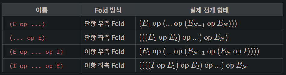 위와 같은 형태를 단항 좌측 Fold (Unary left fold)라고 부른다. C++17 에서 지원하는 Fold 방식의 종류로 아래 표와 같이 4가지가 있다. (I 는 초기값을 의미)