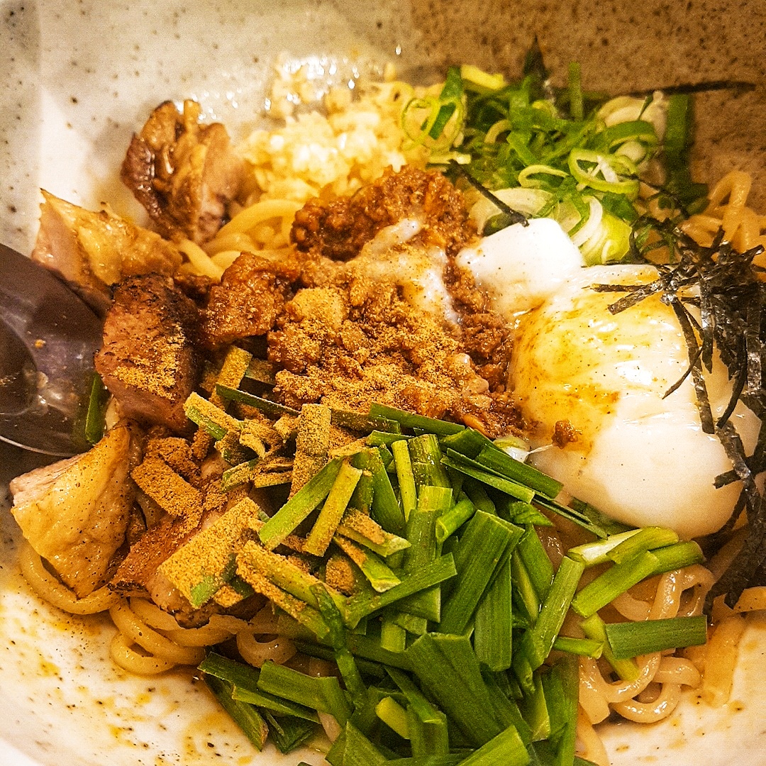 This is '마제소바', spicy mixed noodles without soup! Mix the ingredients to the fullest. It's at the right top in the menu plate!