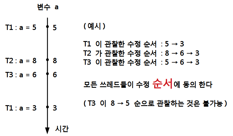 위처럼, 모든 쓰레드에서 변수의 수정 순서에 동의만 한다면 문제될 것이 없다. 즉, 같은 시간에 변수 a 의 값을 관찰했다고 해서 굳이 모든 쓰레드들이 동일한 값을 관찰할 필요는 없다는 뜻이다.