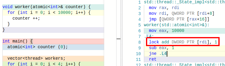 lock add DWORD PTR [rdi], 1 부분이 바로 ++counter 에 해당한다. lock add 의 경우, rdi 에 위치한 메모리를 읽고, 1을 더하고, 다시 rdi 에 위치한 메모리에 쓰기를 모두 해버린다. CPU 에 따라 위와 같은 원자적인 코드를 실행할 수 있는지 없는지는 갈릴 수 있다.