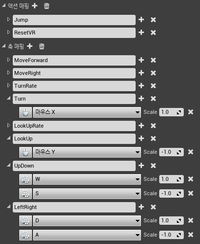 바인딩을 설정한 후에 InputComponent 의 BindAxis 와 BindAction 이라는 함수를 이용해 폰의 움직임을 연결시켜 준다.