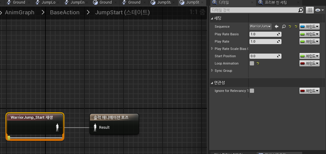 위에서 설정한 점프 애니메이션은 사실 InfinityBladeWarriors 가 아닌, 기본 제공 애니메이션에서 가져온 에셋이다. 언리얼은 인간형 캐릭터의 경우 스켈레톤의 구성이 달라도 애니메이션을 교환할 수 있는 기능(리타깃)을 제공한다.